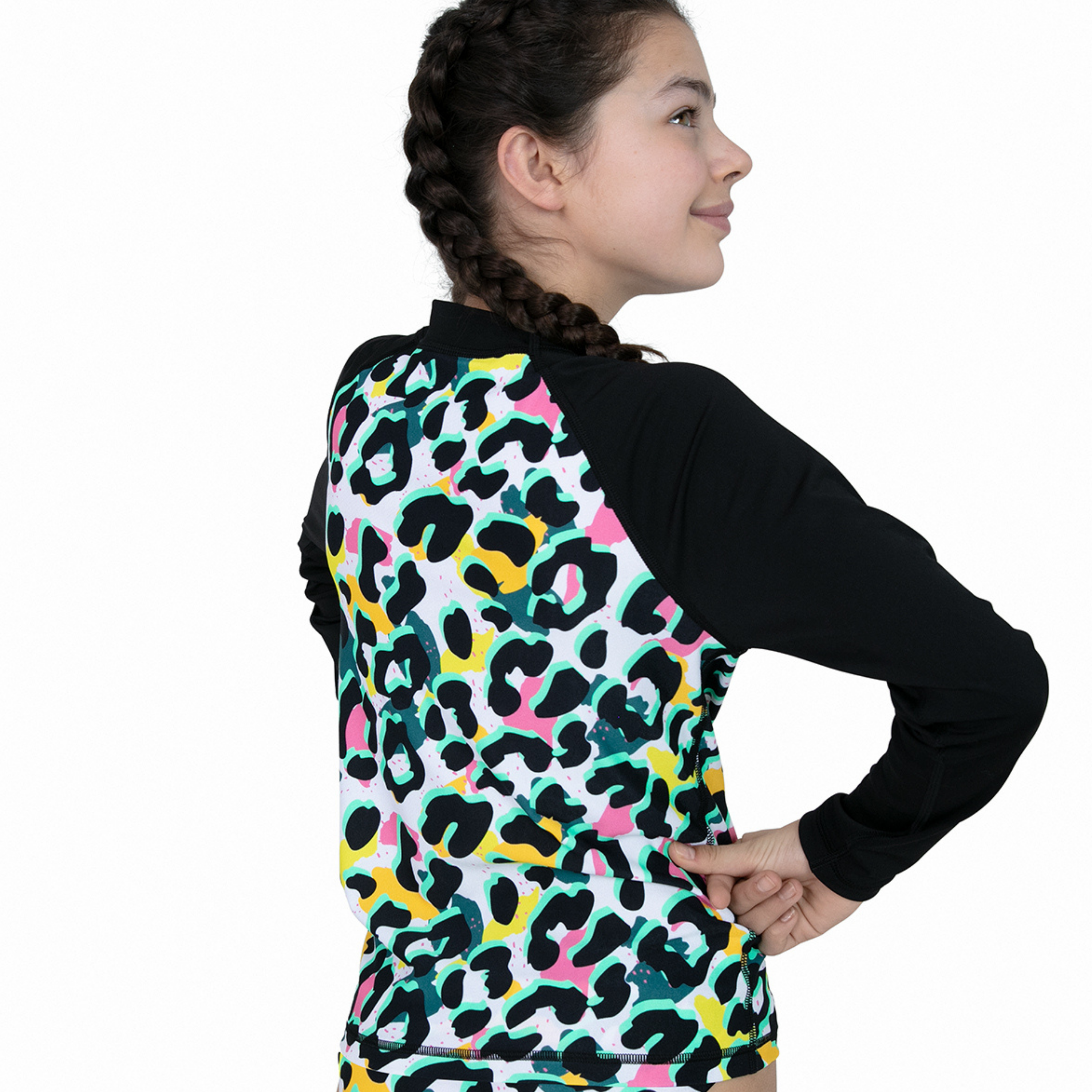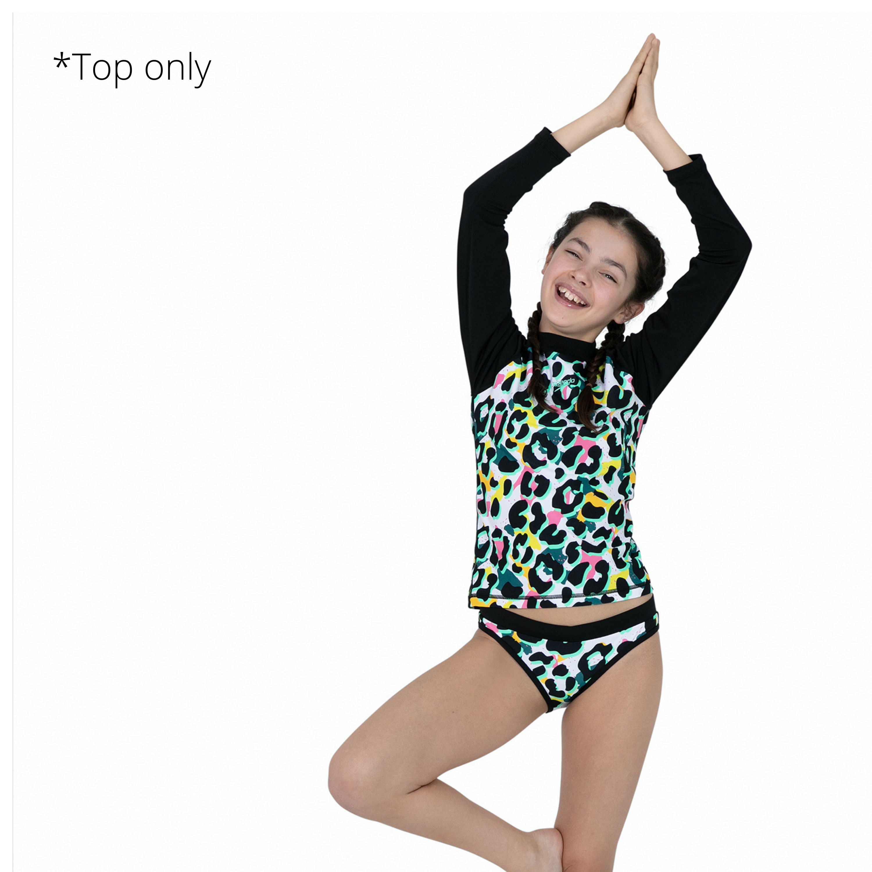 Girls will love this bold and bright Rash set featuring rainbow leopard print detail and contrasting black sleeves. This pull-on style features a crew neck and long sleeves, giving sun protection for the chest, back and arms/ The Top is UPF 40+ and is made from our 100% chlorine resistant Endurance+ fabric is great for outdoor water fun. Stretchy and quick drying to keep kids comfortable in and out of the water.