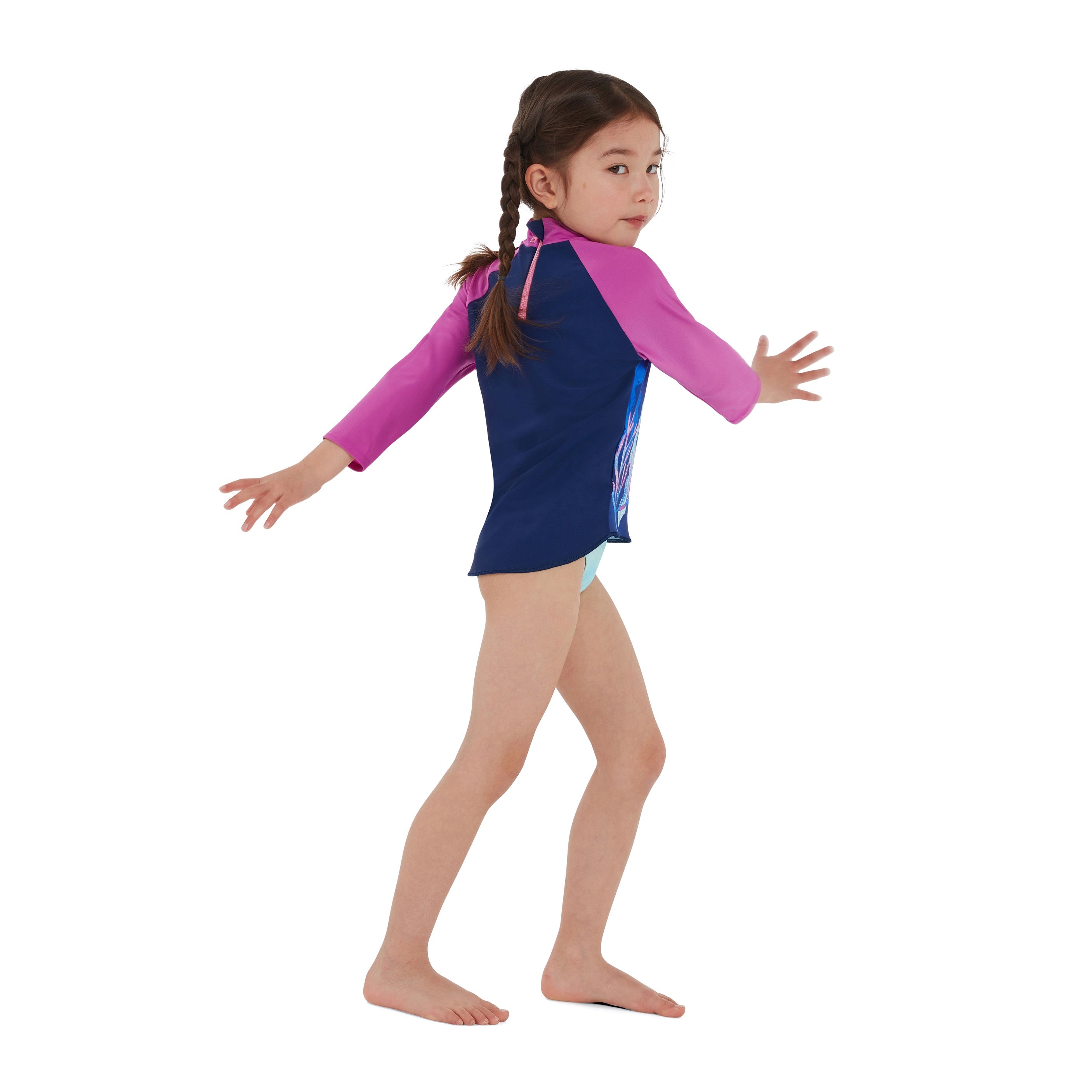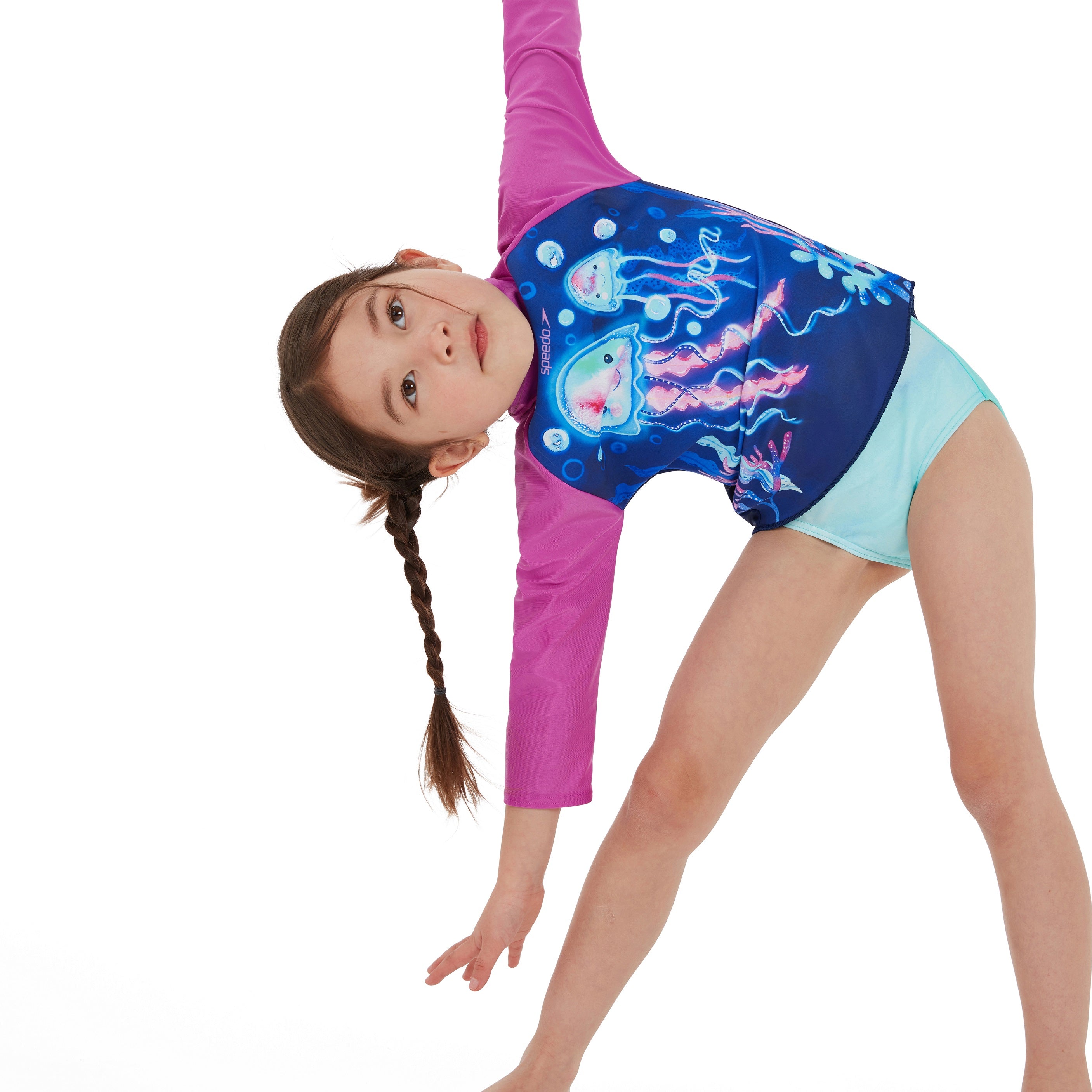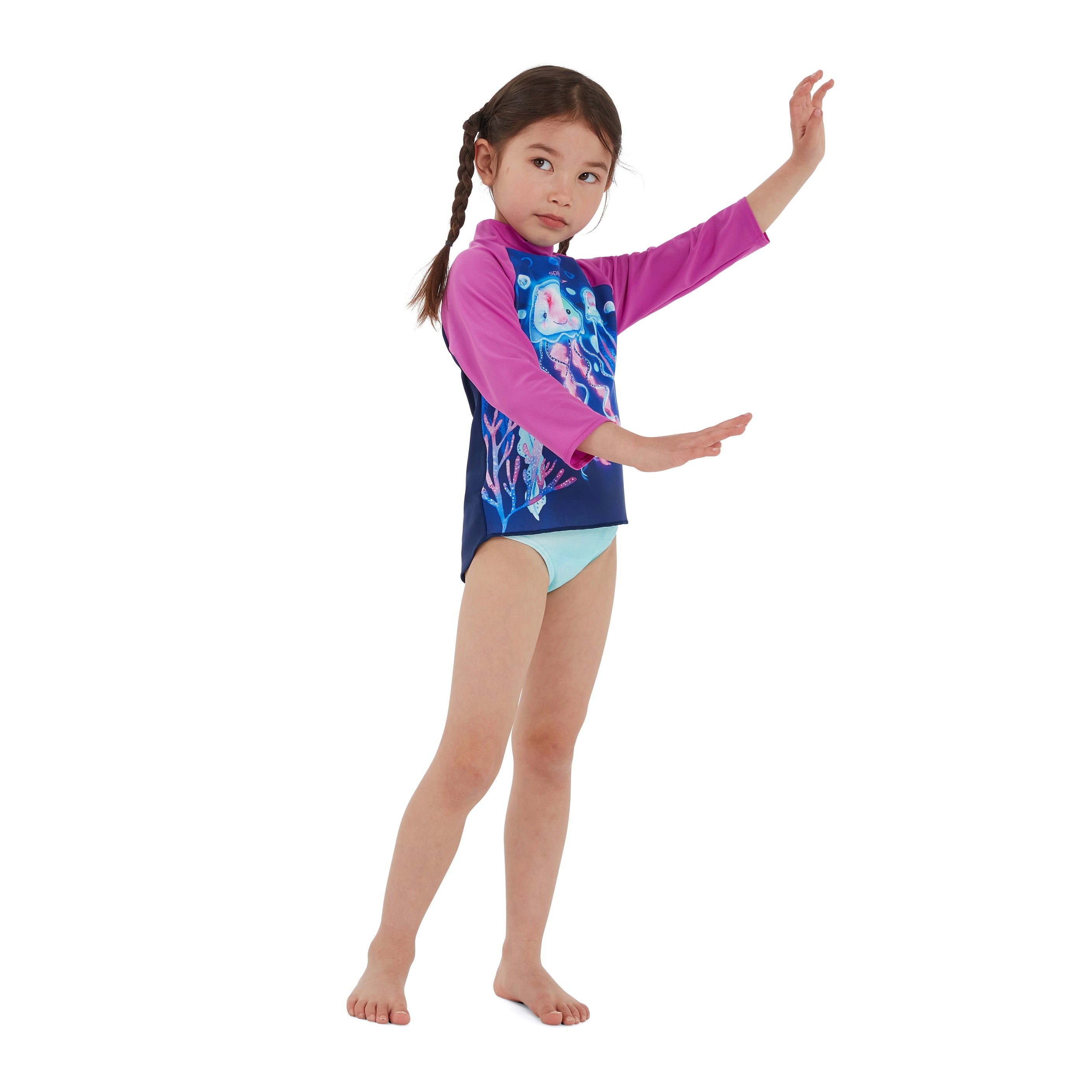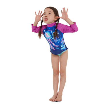 Bring the magic of the ocean to life with our Learn to Swim range. This pretty long-sleeve Printed Rash Top includes a playful underwater jellyfish character. Perfect for sunny holidays and outdoor fun, the top includes UPF40+ fabric sun protection and a dipped-back hem for extra coverage. A zip-up back allows for easy wet-and-dry changing and the shape-retaining fabric stretches so little bodies can move around without feeling restricted. Soft and stretchy, our Endurance 10 fabric ensures kids can swim in comfort, whilst CREORA® HighClo™ means their suit fit them like new for longer.