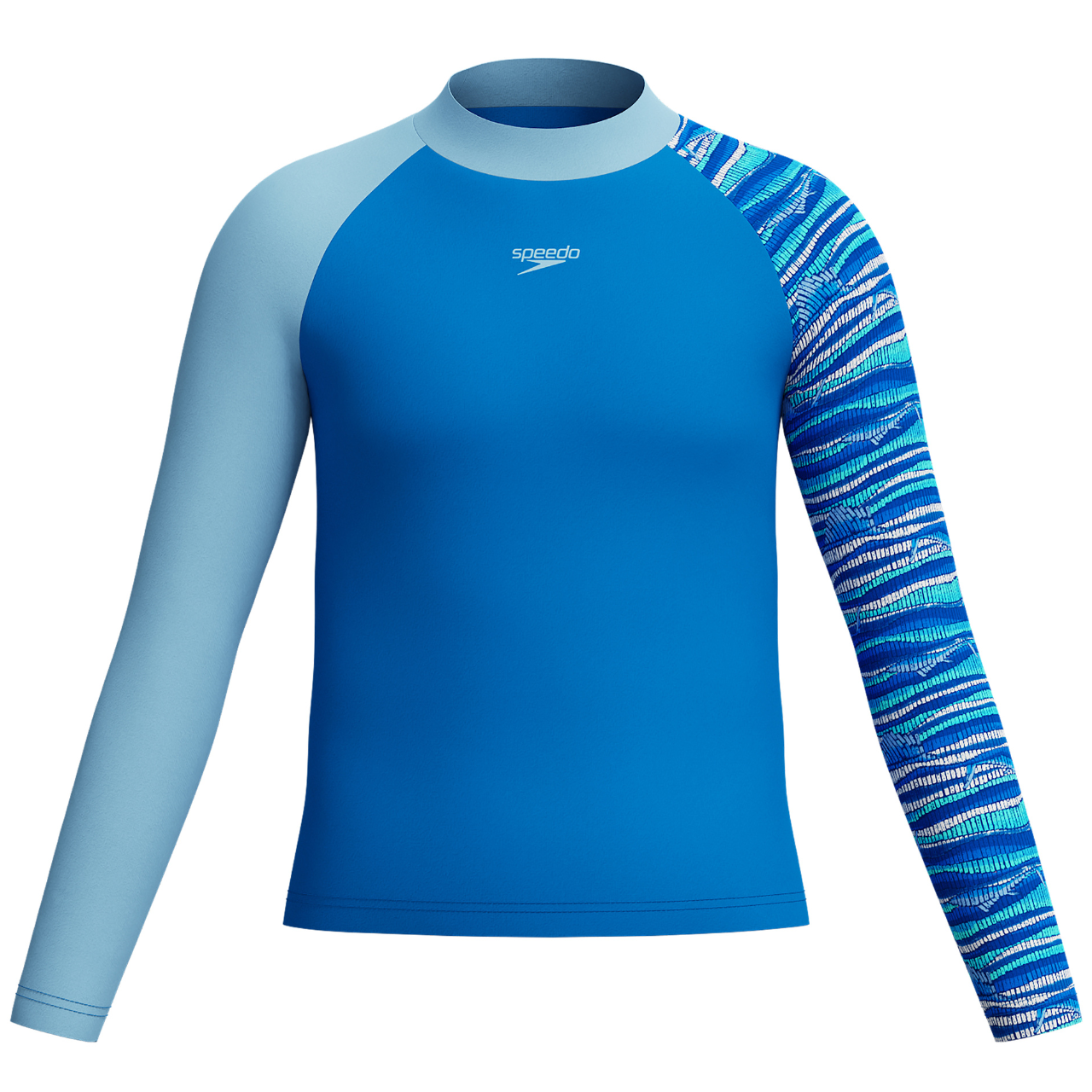 Explore the depths with confidence in the Speedo Junior Boys Lagoon Blue Print long sleeve Sun Top. This bright, pull-on style provides UPF40+ sun protection and vibrant colors with EnduraBrite, making it perfect for active beach days. Whether they're swimming or surfing, your child can do it all with safety and style.