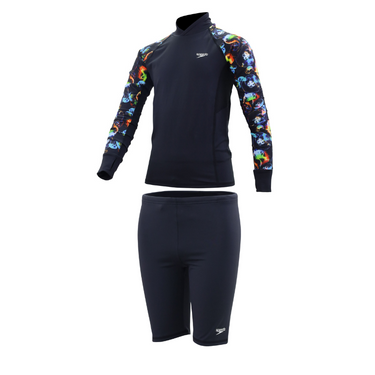 Turn your day in the water into a fun adventure with the youth deluxe long-sleeve set. Featuring black color and jellyfish designs, this top is designed to promote movement and allows comfort while in the water. It has handguards that allow you to move freely without your sleeves moving around, making it ideal for any aquatic activities.