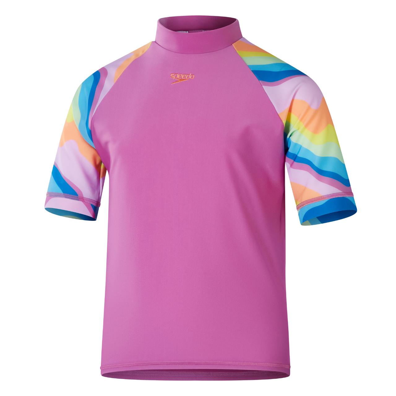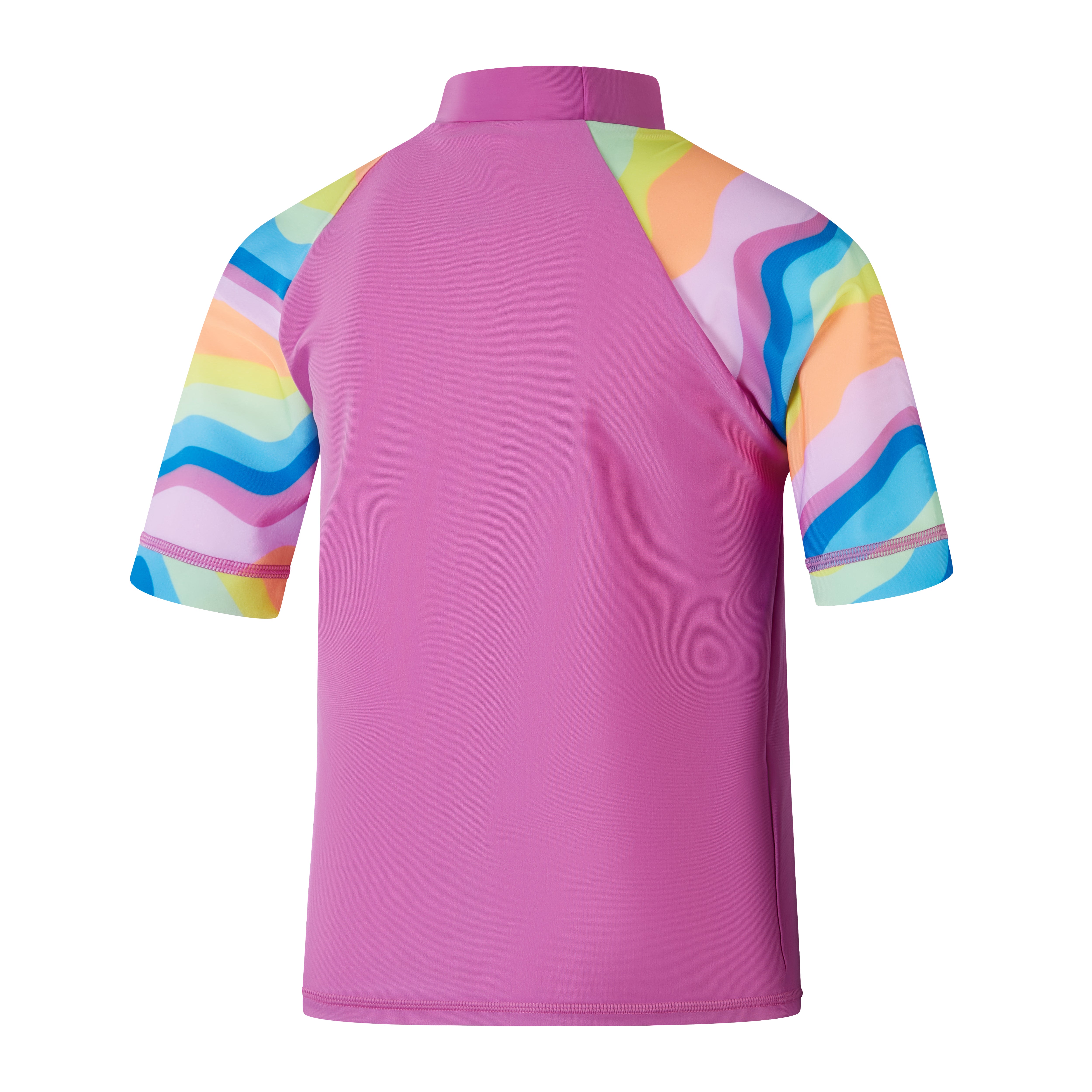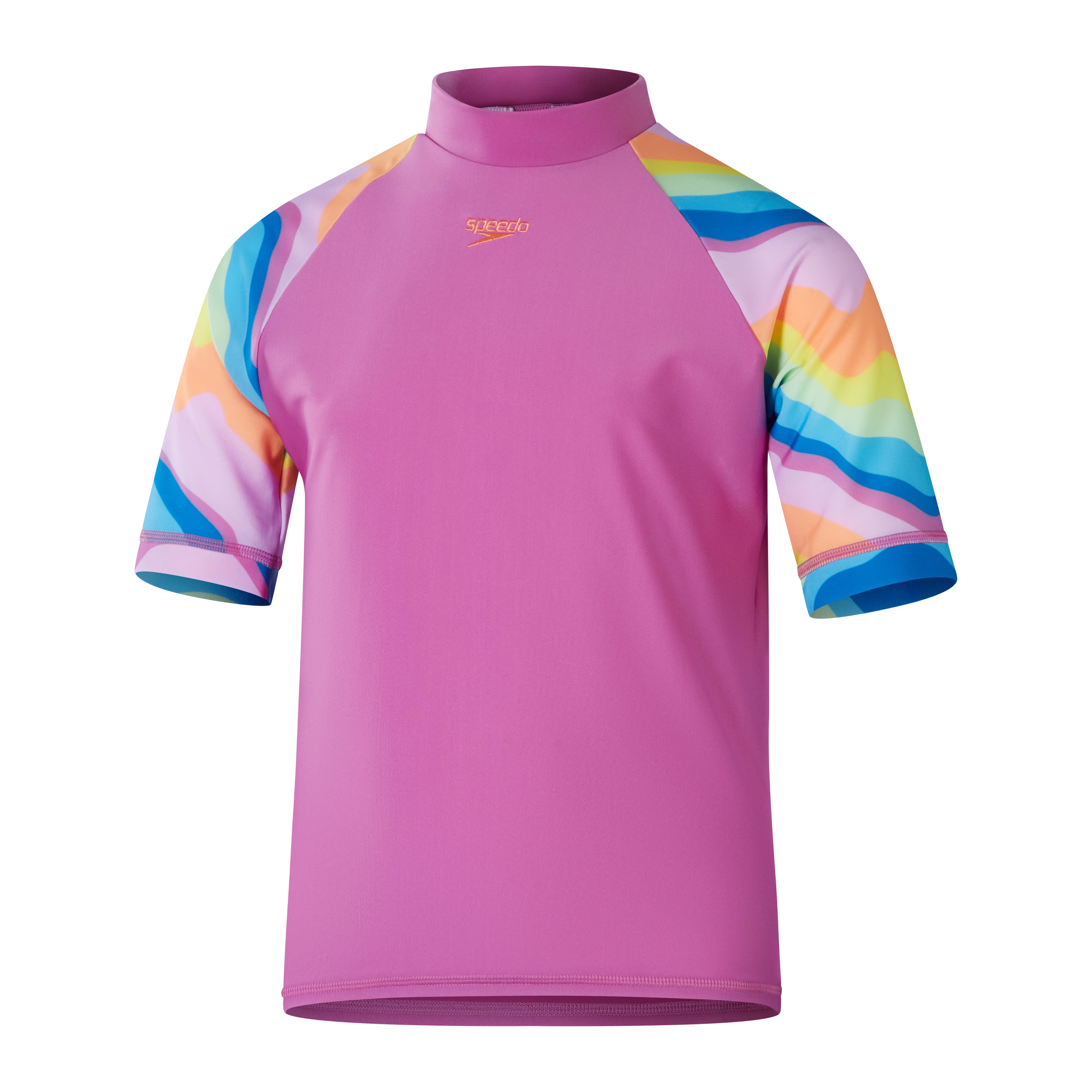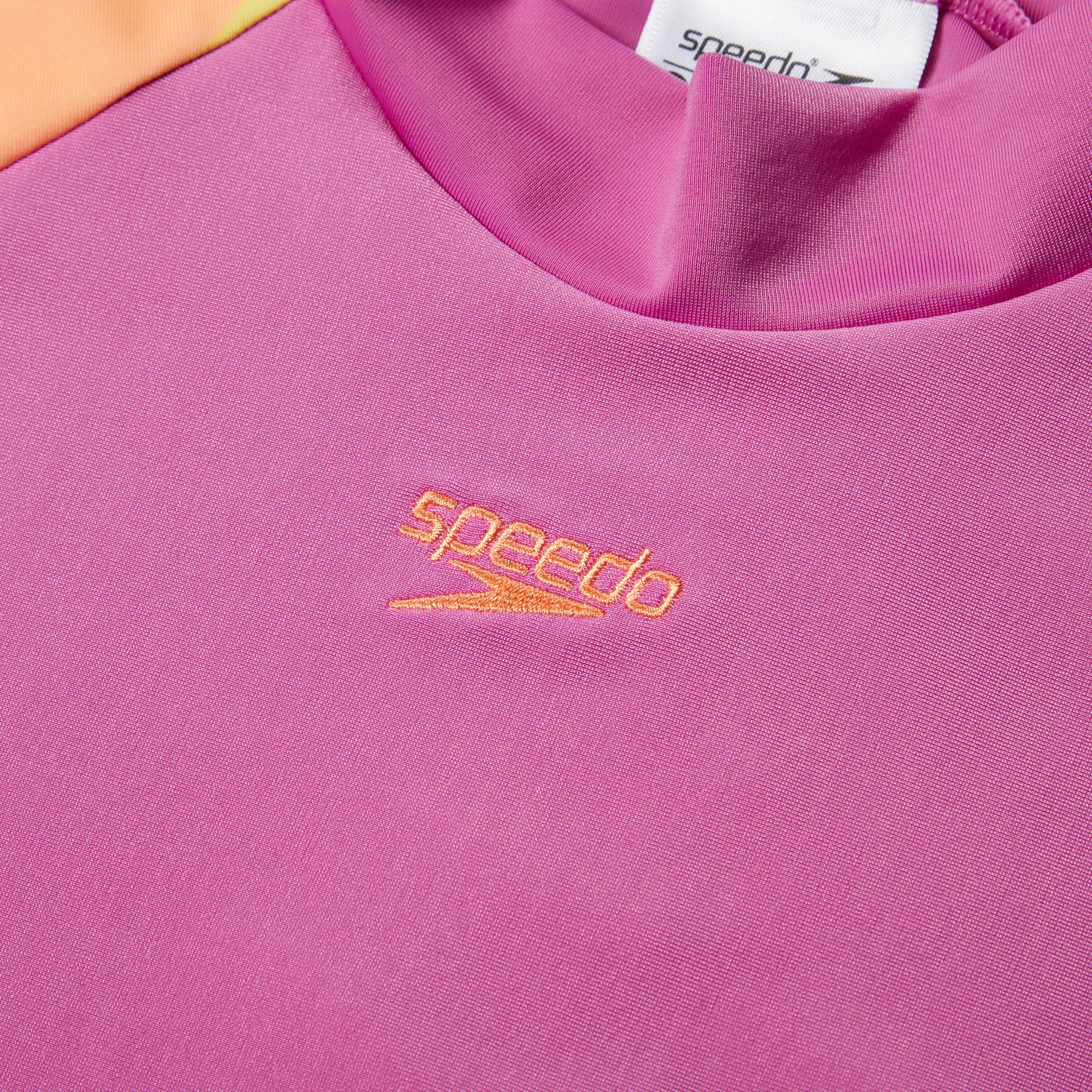 Radiate summer vibes wearing this stylish Short Sleeve Sun Top in soft pink, featuring our colorful botanical print on the sleeves. The comfy pull-on sun top includes UPF40+ for sun protection in and out of the water. Taking young swimmers from the beach to the pool, our EnduraBrite fabric offers higher chlorine resistance than standard swimwear fabrics, delivers superb color performance, and fits like new for longer with CREORA® HighClo™. Made in part from recycled plastic bottles - the polyester yarn in the EnduraBrite fabric is made from 100% post-consumer waste.
