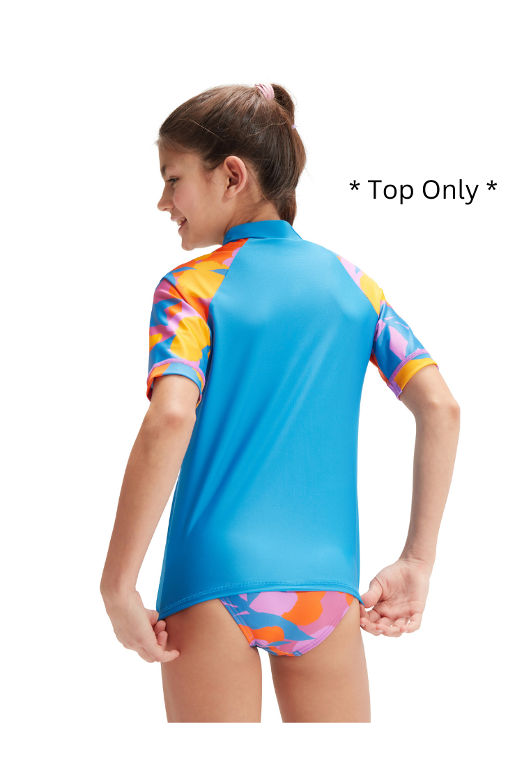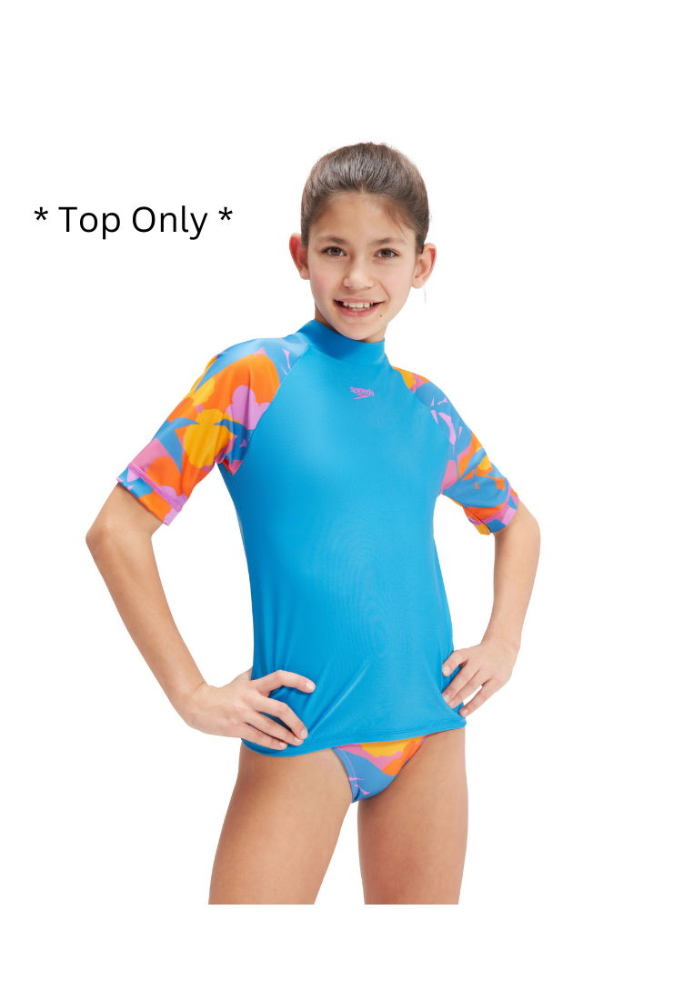 Radiate summer vibes by wearing this stylish sleeve top in beautiful blue, featuring our colorful macro floral print on the sleeves. The comfy pull-on sun top includes UPF40 for sun protection in and out of the water. Taking young swimmers from the beach to the pool, our Eco EnduraBrite fabric offers higher chlorine resistance than standard swimwear fabrics, delivers superb color performance, and fits like new for longer with CREORA® HighClo™.