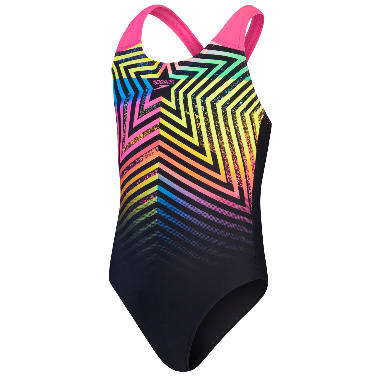 Shine like the star that you are wearing this brightly colored Splashback featuring a radiating star graphic. Perfect for swimming lessons, the splashback straps are set away from the shoulders to increase freedom of movement, allowing young swimmers to move without feeling restricted. Ideal for regular pool sessions, our EnduraFlex fabric offers higher chlorine resistance than standard swimwear fabrics and fits like new for longer with CREORA® HighClo™. In addition, nylon yarns in the EnduraFlex fabric are made from 100% pre-consumer waste, such as factory waste fabric.