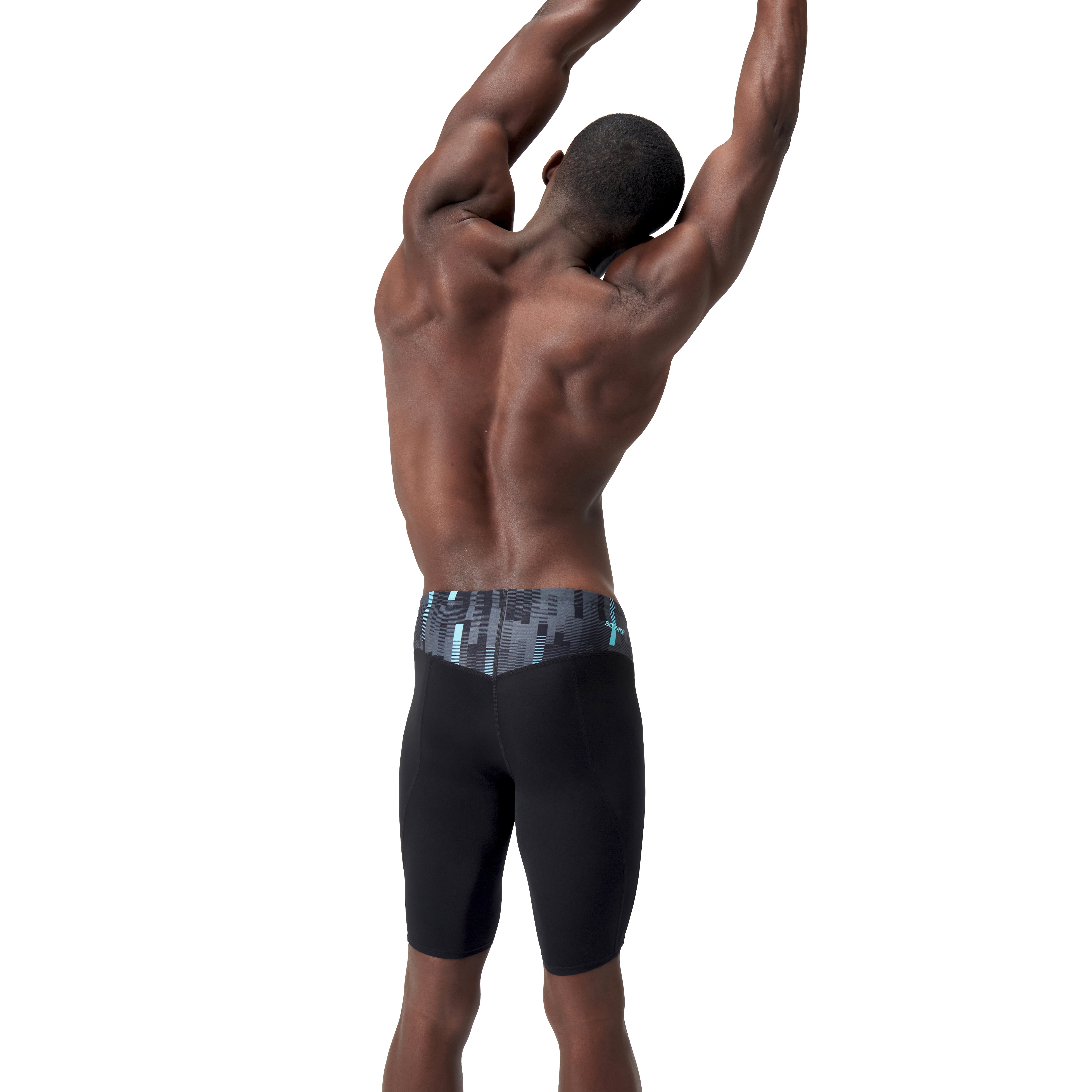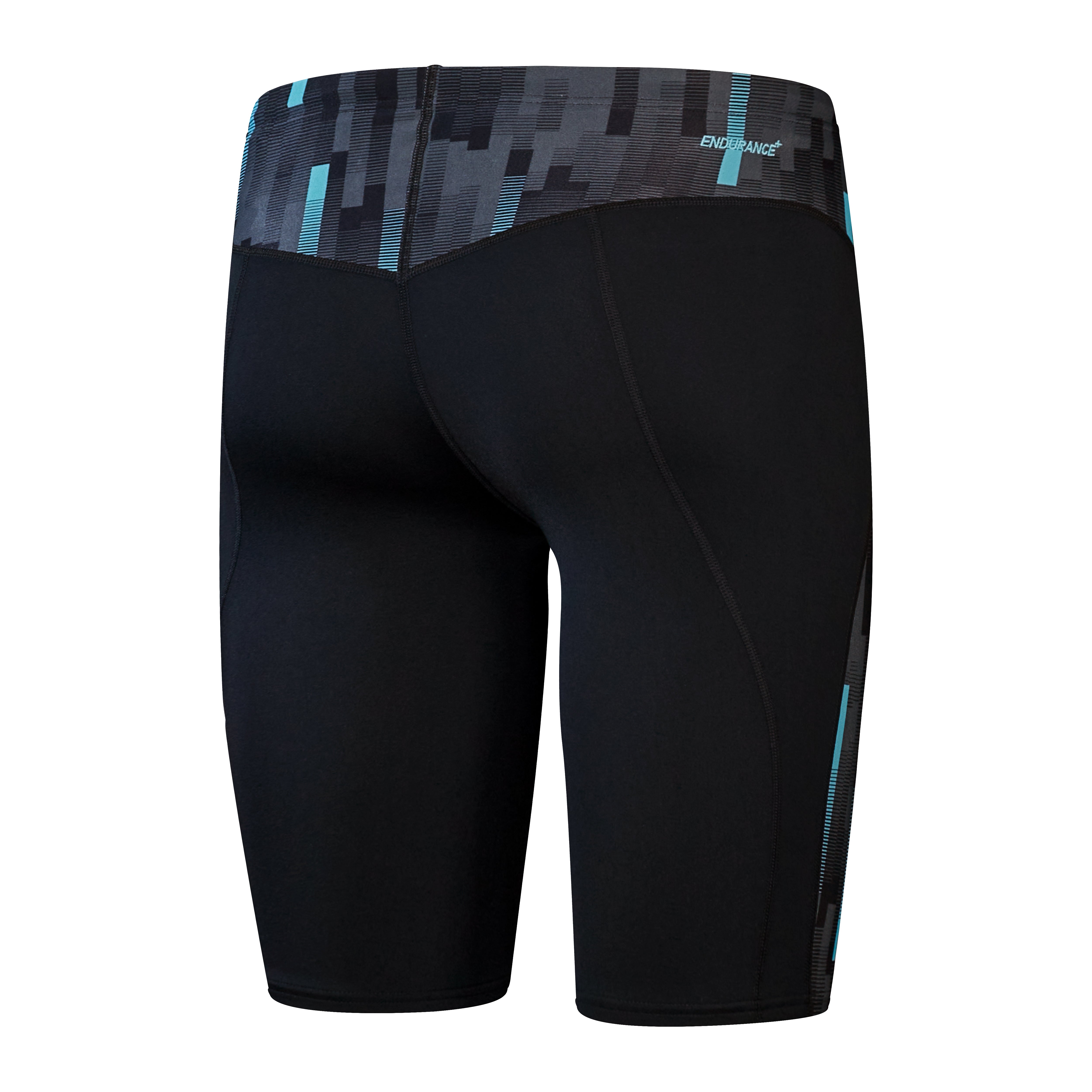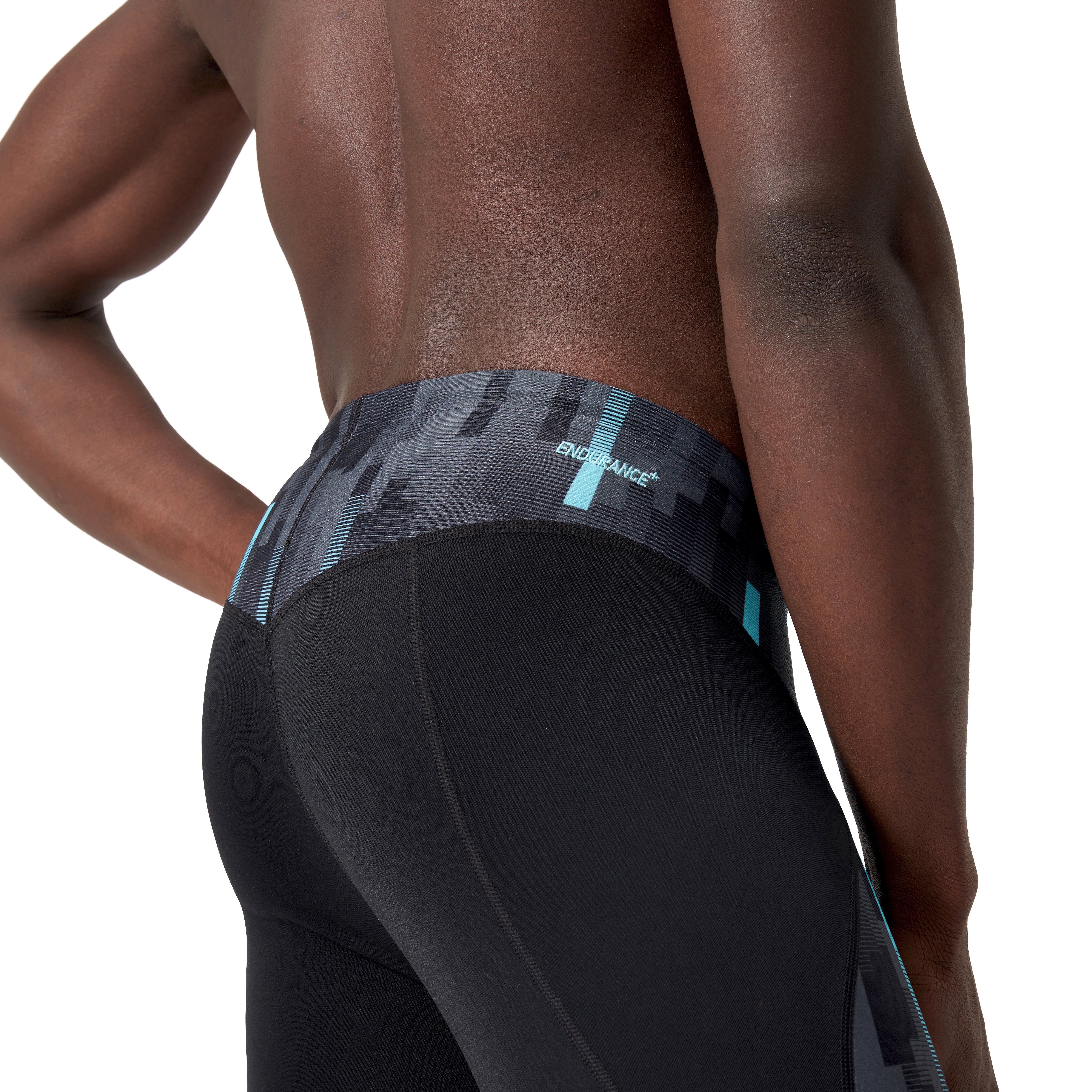 Performance swimwear. This sleek, tech-inspired Endurance+ MAX Compression Jammer is packed with technical innovations that help take your training to the next level. Striking in black with a distorted glitch effect print, the jammer includes an elasticated waistband with a silicone gripper and a flat drawstring that sits within a dedicated waistband channel for a customized fit. The V-cut design with power mesh liner ensures you feel supported and comfortable, while the Endurance+ Max fabric is quick-drying and chlorine-resistant. Both the polyester and PBT yarns in this fabric are made from 100% post-consumer waste, such as recycled plastic bottles.