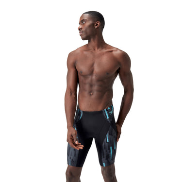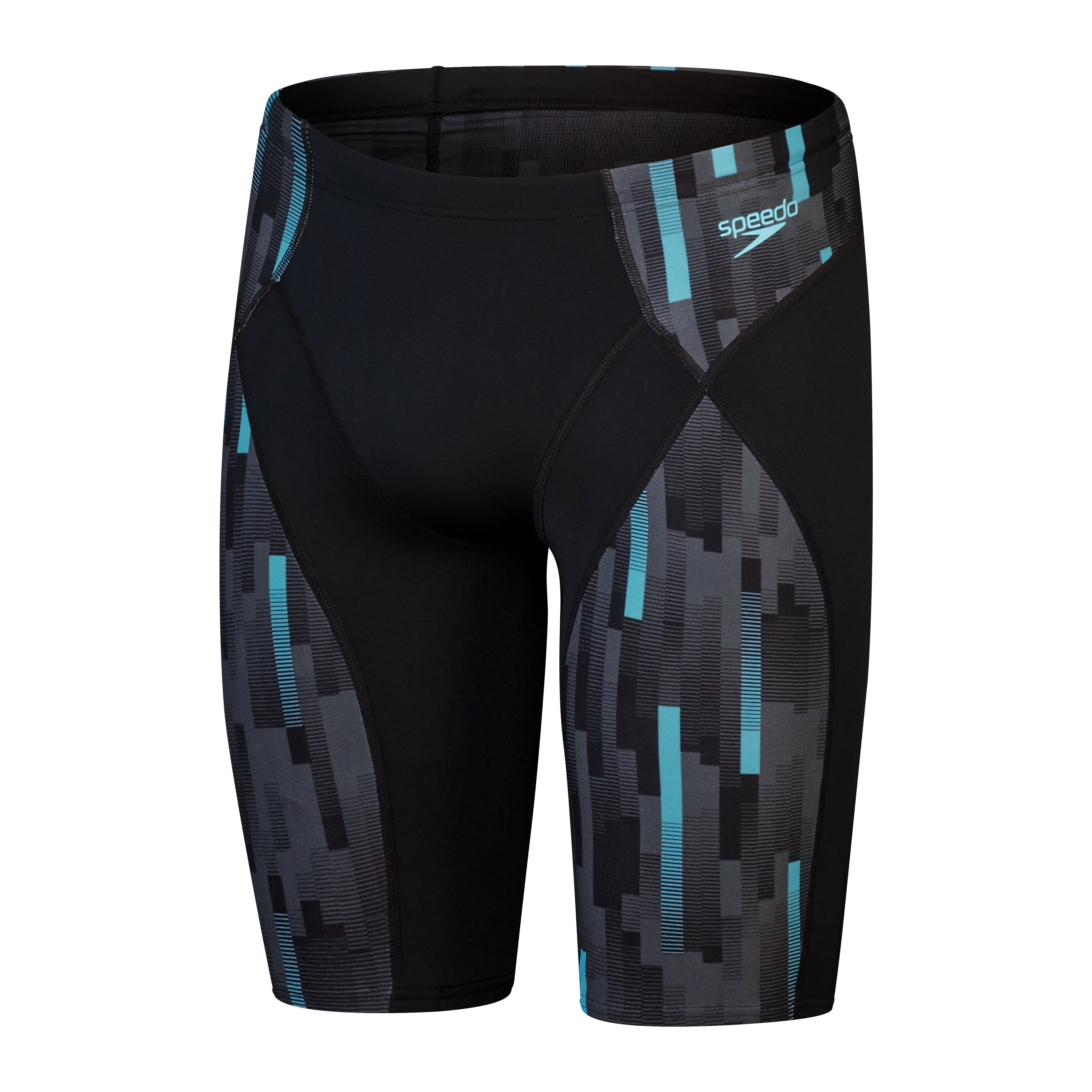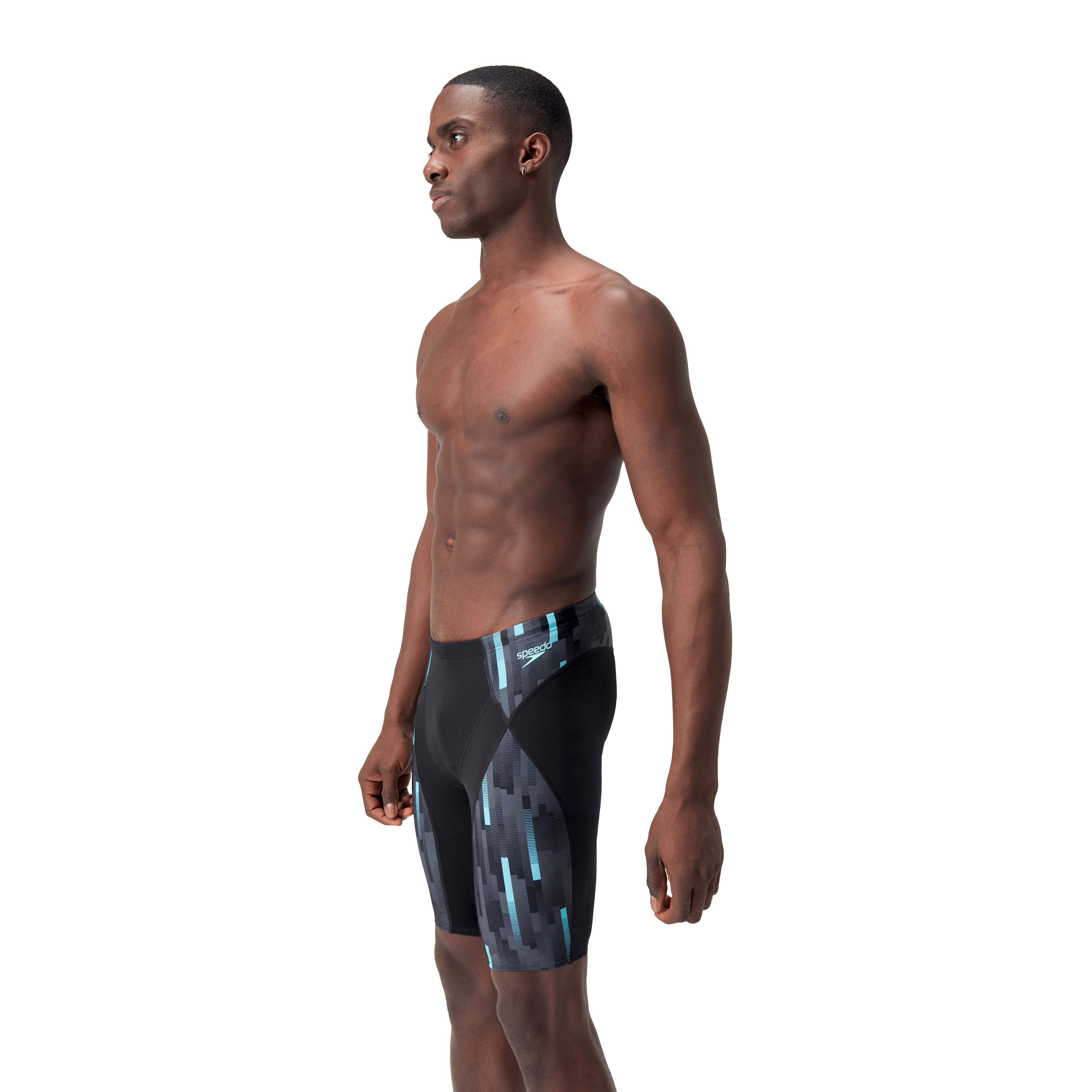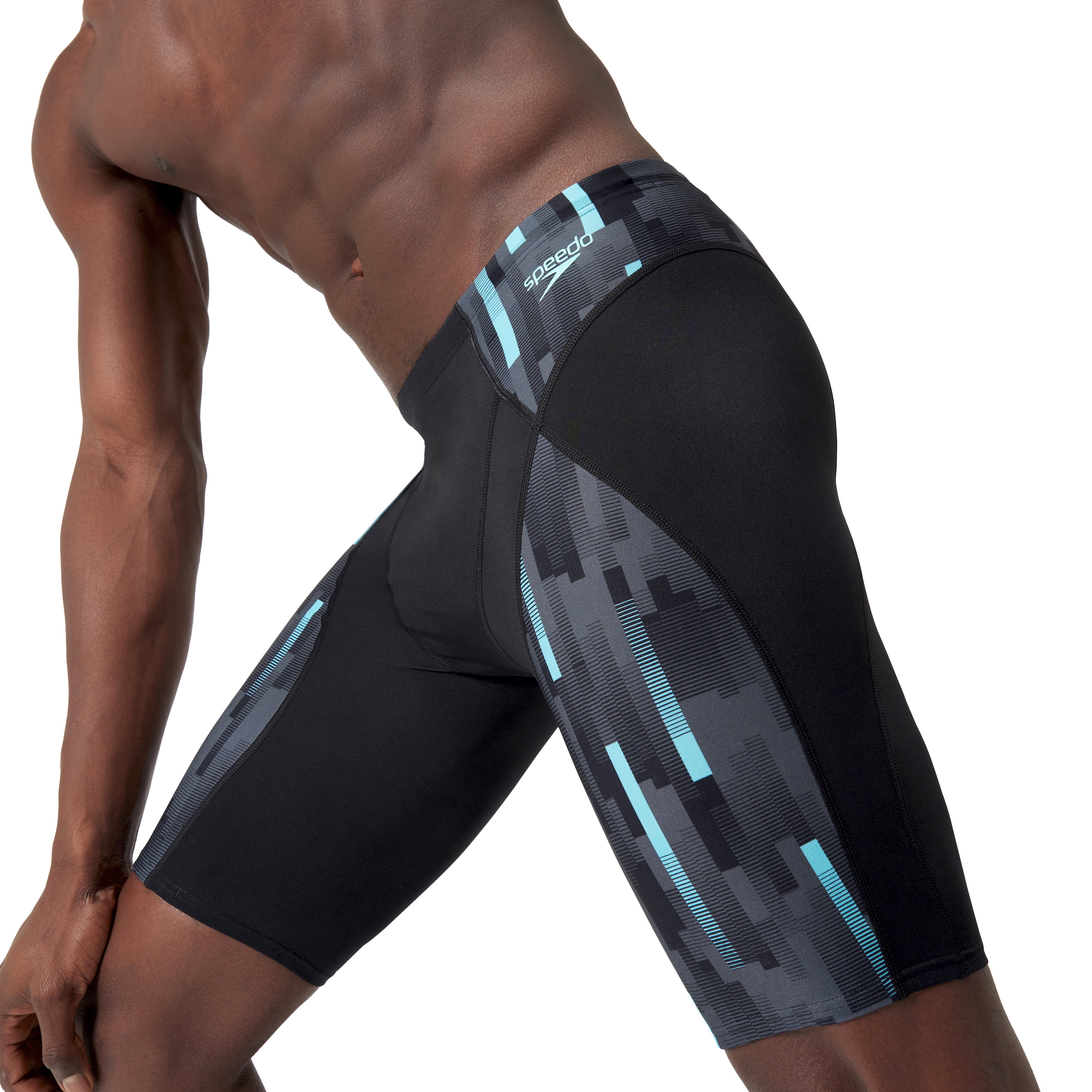 Performance swimwear. This sleek, tech-inspired Endurance+ MAX Compression Jammer is packed with technical innovations that help take your training to the next level. Striking in black with a distorted glitch effect print, the jammer includes an elasticated waistband with a silicone gripper and a flat drawstring that sits within a dedicated waistband channel for a customized fit. The V-cut design with power mesh liner ensures you feel supported and comfortable, while the Endurance+ Max fabric is quick-drying and chlorine-resistant. Both the polyester and PBT yarns in this fabric are made from 100% post-consumer waste, such as recycled plastic bottles.