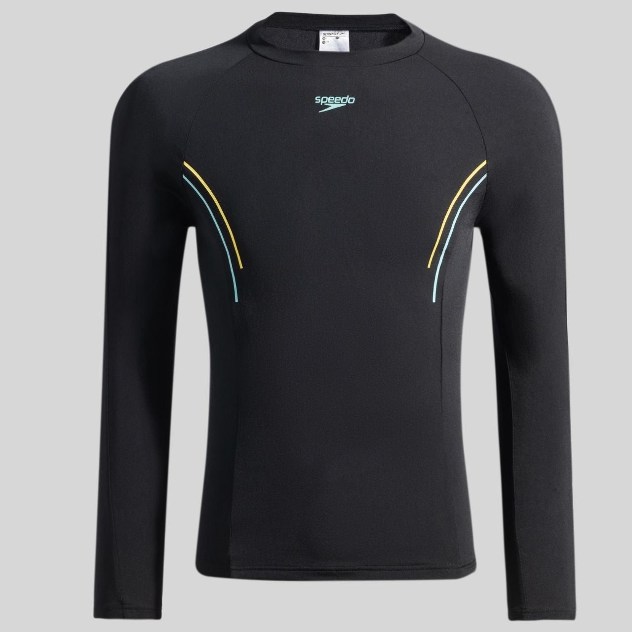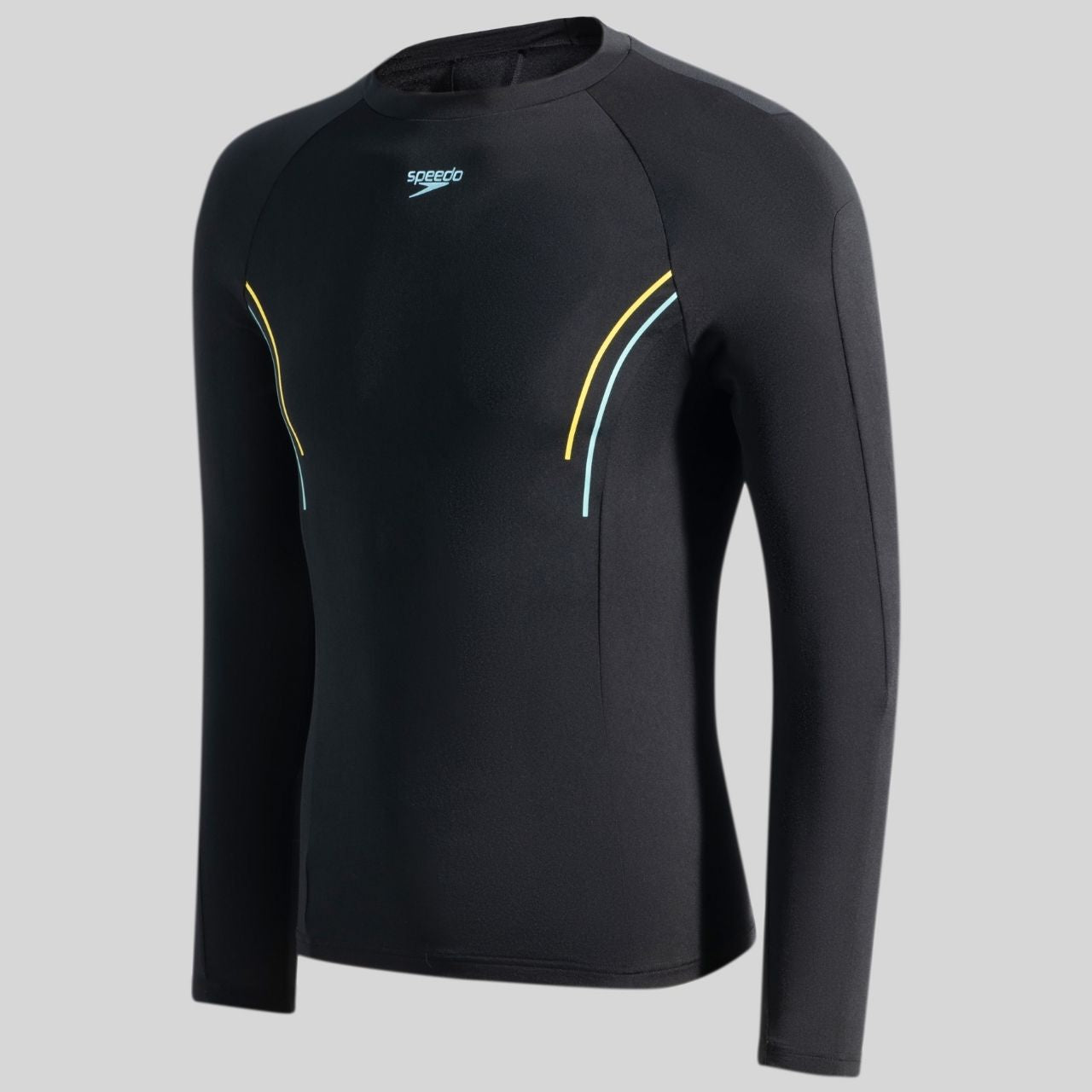 Hero 6.0 Men Long Sleeve Panel Rashguard Light and shadow in sync, presenting a new style of swimwear. Light and shadow in sync, presenting a new style of swimwear. Advanced fabric technology for unwavering color protection. Endurance + MAX technology keeps water beads rolling off without sticking. Highly resistant to chlorine, offering lasting protection that remains as good as new. Partially made from recycled materials, these swimsuits offer premium comfort and functionality while prioritizing sustainability.