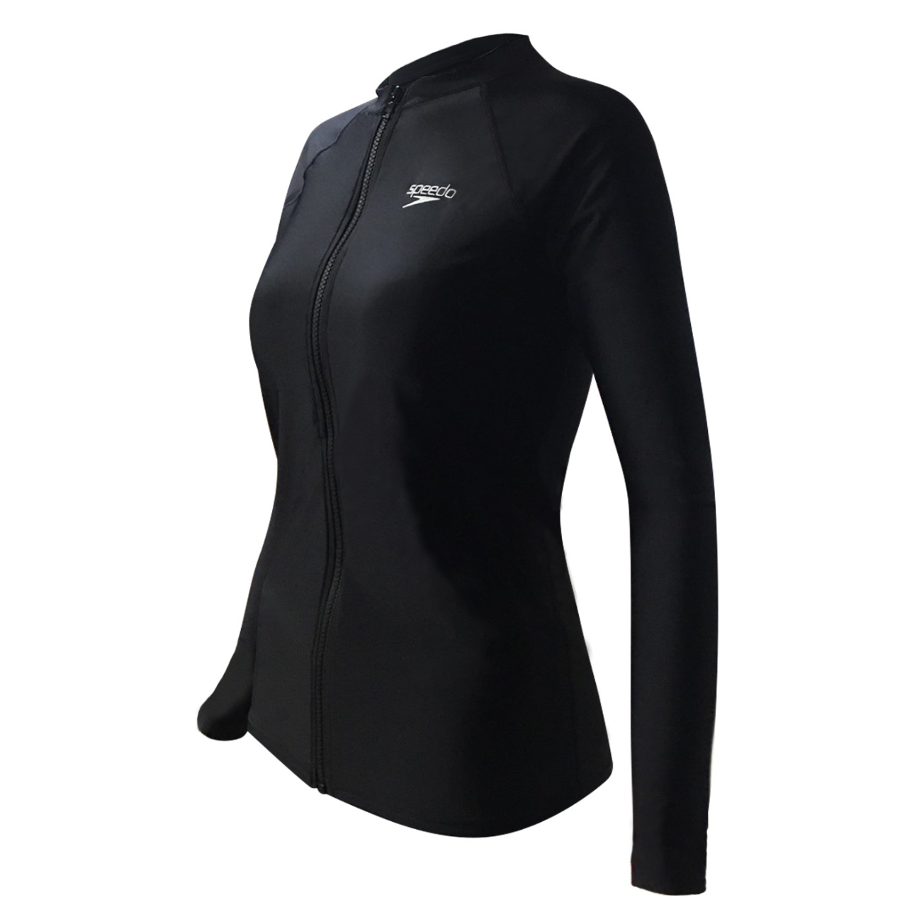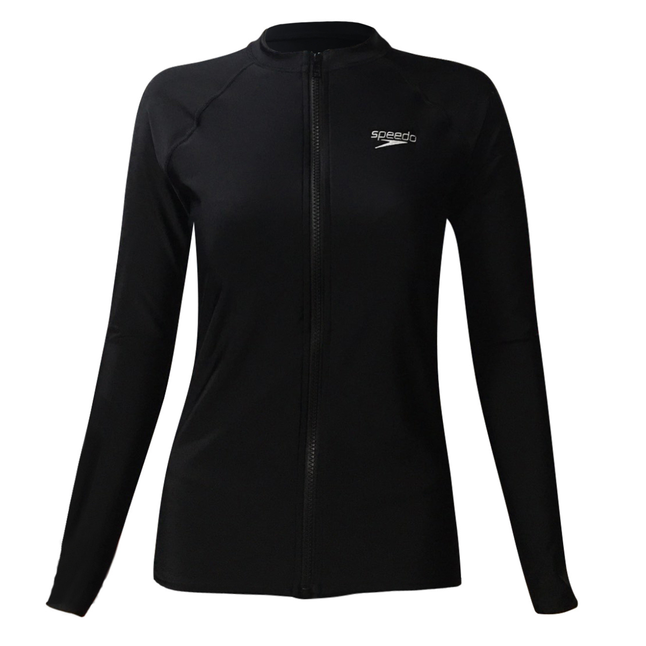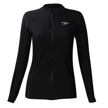 Stay protected and comfortable in the Speedo Female Zip Top Long Sleeve. Designed for superior sun protection and performance, this sleek zip-up rash guard features a full-length front zipper for easy wear and removal. The long sleeves provide extended coverage, making it ideal for swimming, water sports, or outdoor activities. Made from Endurance10 fabric, quick dry, and chlorine resistant fabric, Whether you're training or enjoying a day at the beach. This swim top offers both style and functionality.