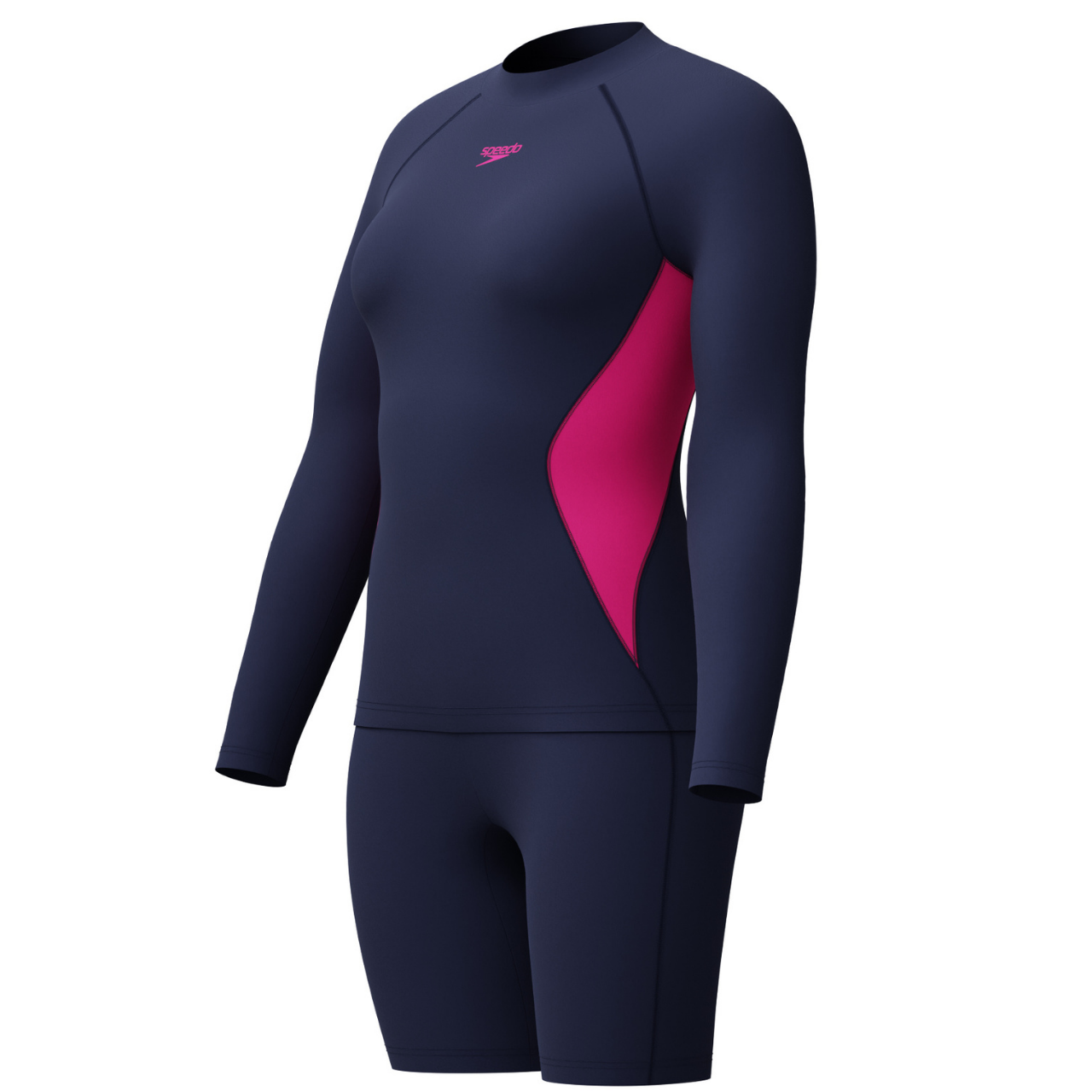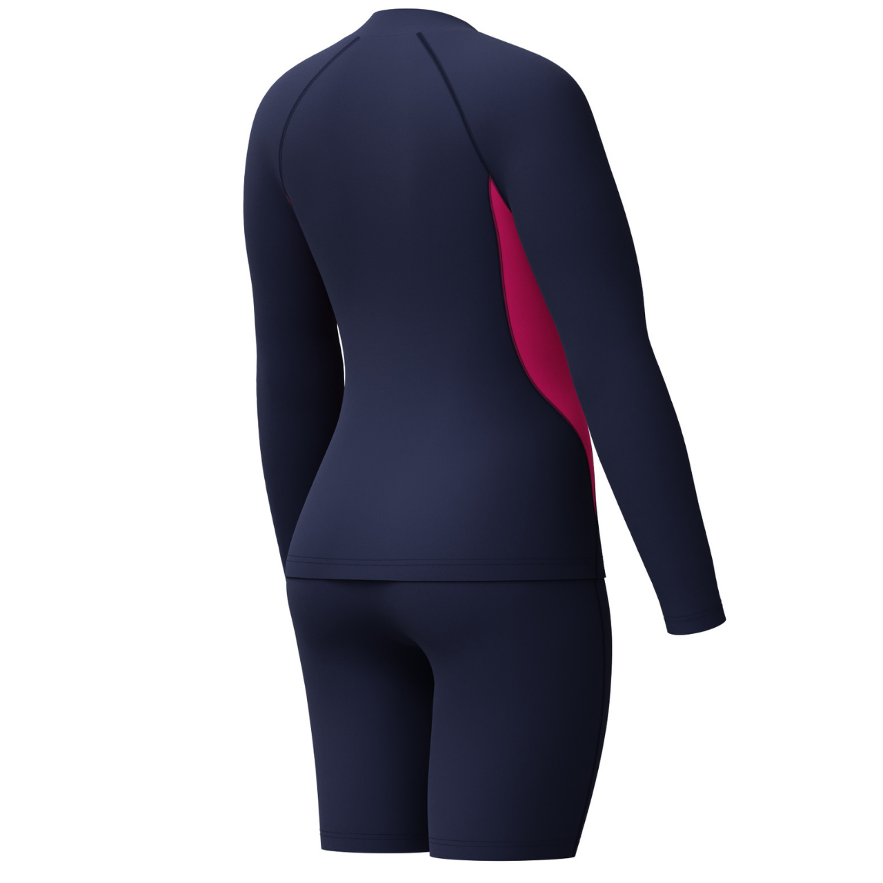 High coverage swimwear for the pool and beyond. This Long Sleeve Rash Top and Jammer Set is ideal for your workout and offers a sleek look in navy with a curved panel neon pink. The long-sleeve top protects against the elements and includes removable bra pads for comfort and modesty. The Jammer short offers coverage to the knee. Soft and stretchy, with higher chlorine resistance than standard swimwear fabrics, our shape-retaining Endurance10 fabric fits like new for longer with CREORA®️ HighClo™️.