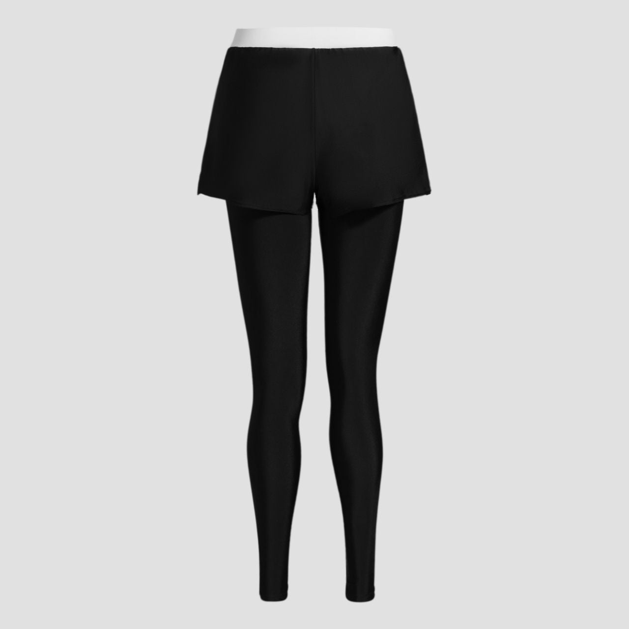 - 2-in-1 design features attached shorts over full-length leggings for added coverage