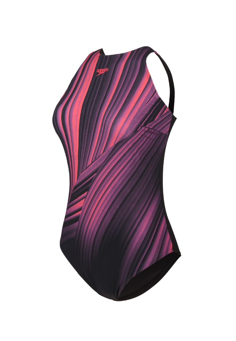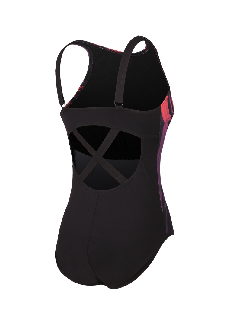 Berry Cool Shaping Enlace 1 Piece swimsuit with a design that combines a modern high neckline and beautiful cross straps at the back, helping to shape and enhance the body contours. The shaping fabric smooths while the adjustable straps ensure a snug fit. The suit includes removable bra pads for comfort and soft ECO SHAPE COMPREX fabric, and this swimsuit is perfect for workouts, combined with LYCRA® XTRA LIFE™ which is extremely chlorine resistant and twice as durable as standard swimwear fabrics.