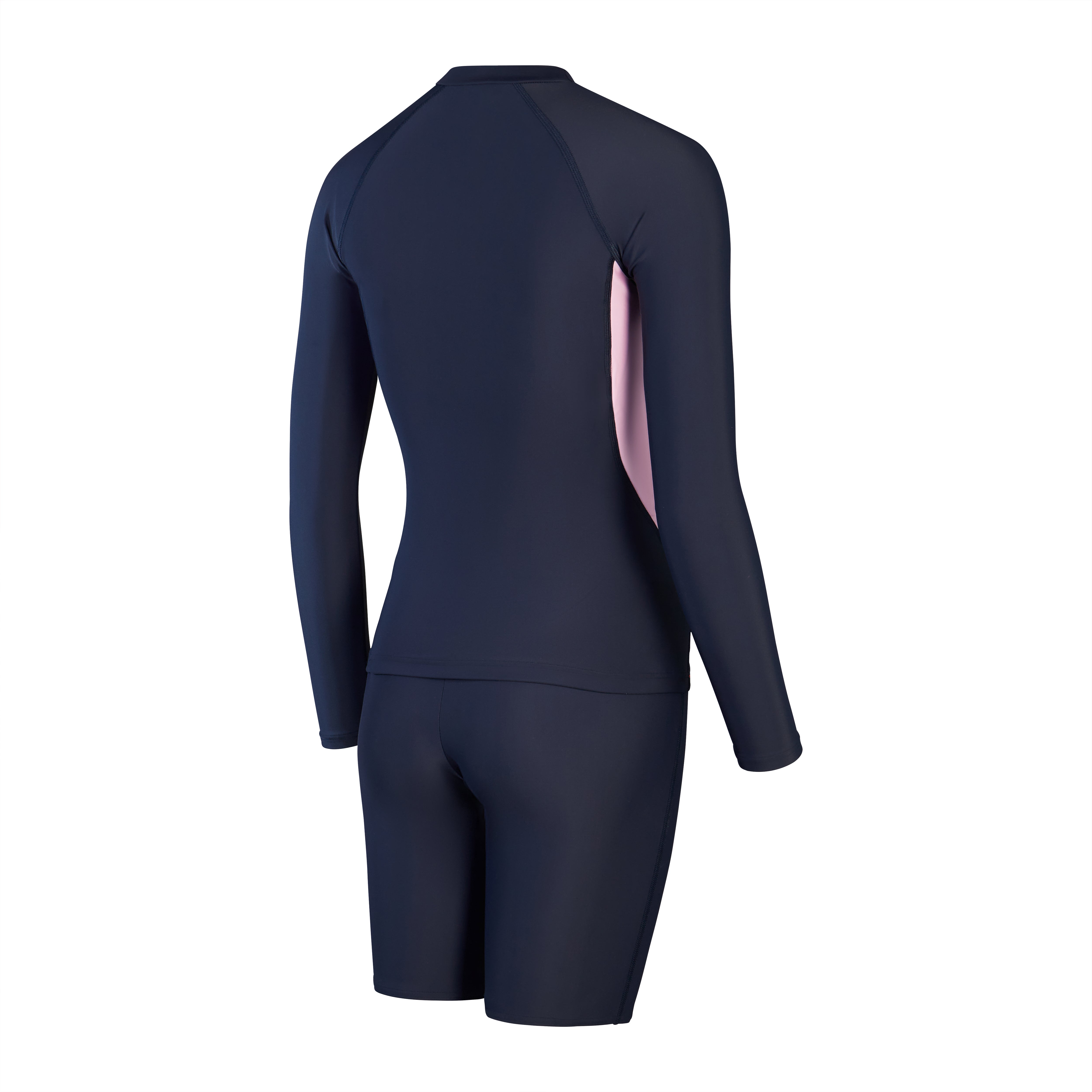 High-coverage swimwear for the pool and beyond. This Funny Pink Long Sleeve Rash Top and Jammer Set is ideal for your workout and offers a sleek look in navy with a curved panel pop of pink. The long-sleeve top protects against the elements and includes removable bra pads for comfort and modesty. The Jammer short offers coverage to the knee. Soft and stretchy, with higher chlorine resistance than standard swimwear fabrics, our shape-retaining Endurance10 fabric fits like new for longer with CREORA® HighClo™.