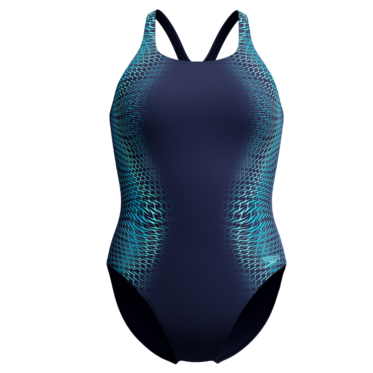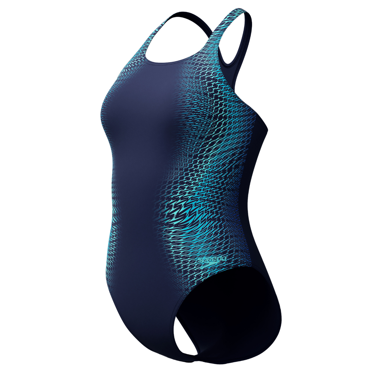 The Speedo Tech Panel Splice Medalist One Piece - Lagoon Blue looks stylish as you fly through your workout in this striking 'warped' Boom-print swimsuit. Stay agile and comfortable in the classic Medalist design, which aids shoulder movement and flexibility during training. A supportive elastic under band and PBT liner help minimize bust movement for zero distractions during your workout. Cut from Endurance+ Max fabric.