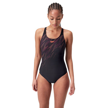 Make a statement in Hyper Boom logo prints. Paying homage to our legacy graphics, this sporty black Hyper Boom Muscle back swimsuit features a graduated print showcasing our evolutionary Hyper Boom graphic in striking shades of fluro red and purple. The muscle-back design and medium-cut leg offer flexibility and freedom of movement, so you can swim in comfort. Front-lined for comfort and modesty, it’s made from our durable Endurance+ fabric, which is quick-drying and chlorine-resistant. Plus, thePolyester yarn in this fabric is made from 100% post-consumer waste, such as recycled plastic bottles.