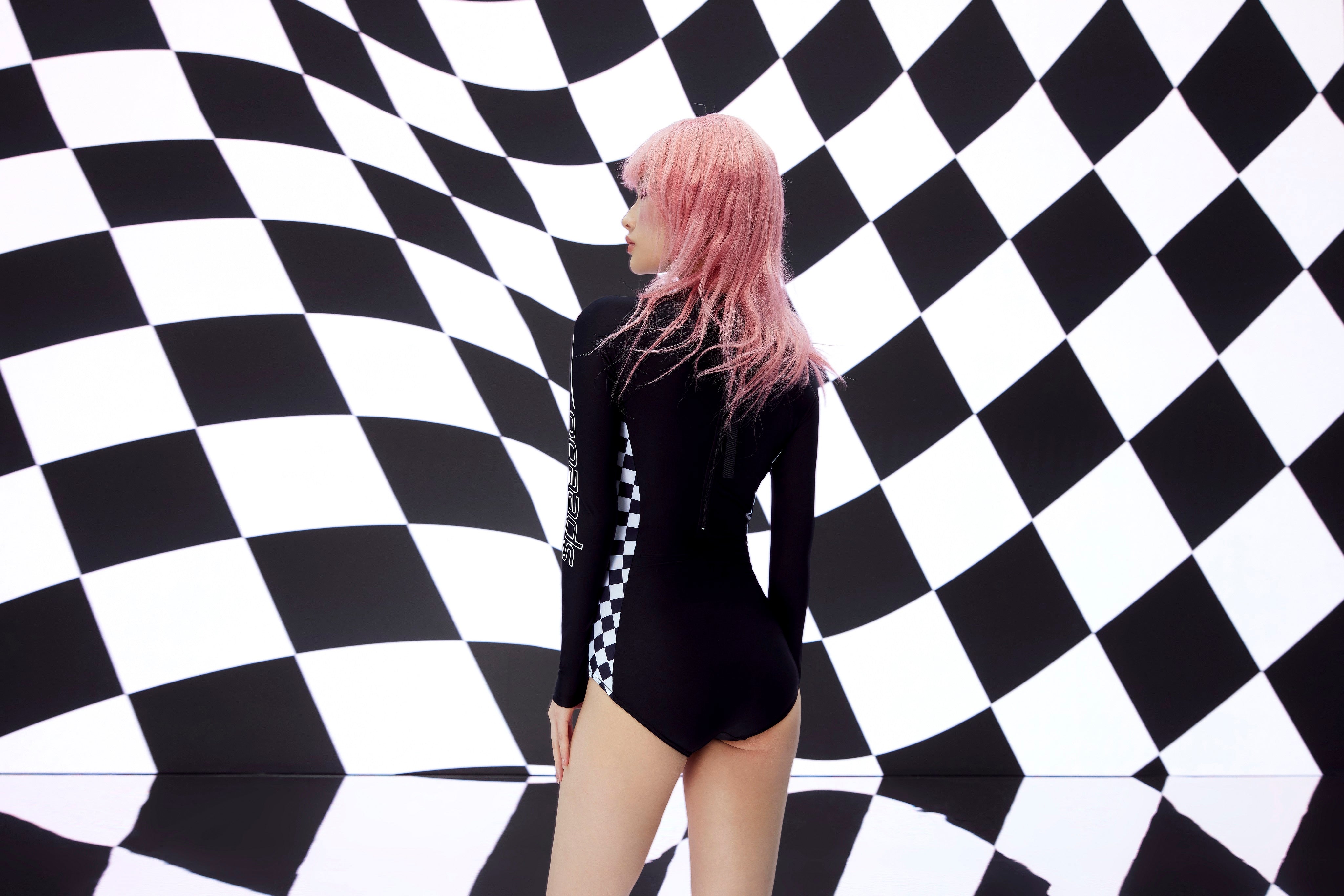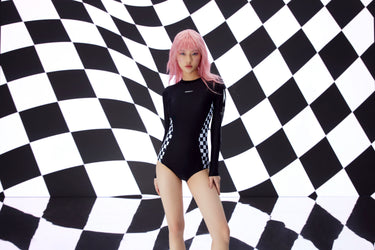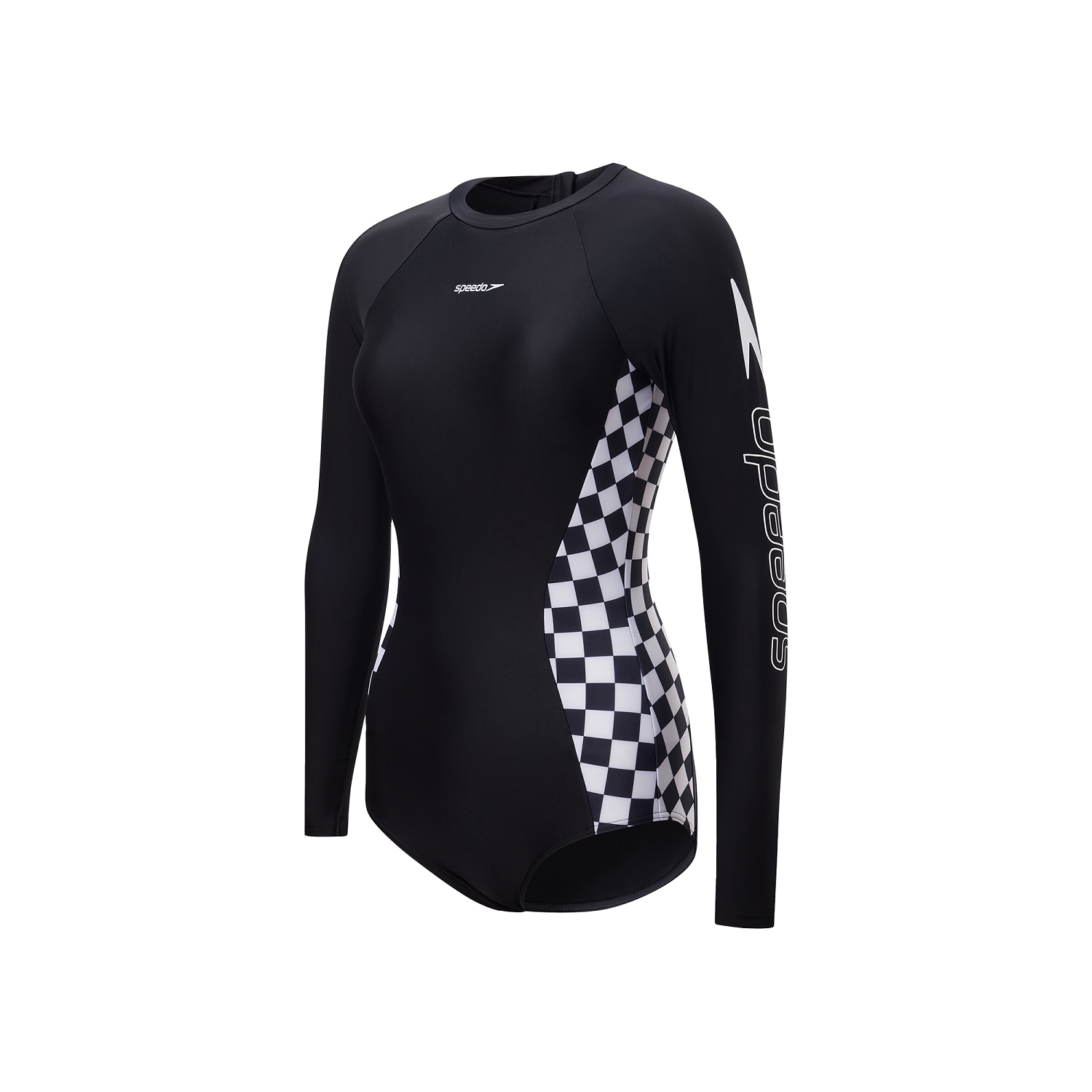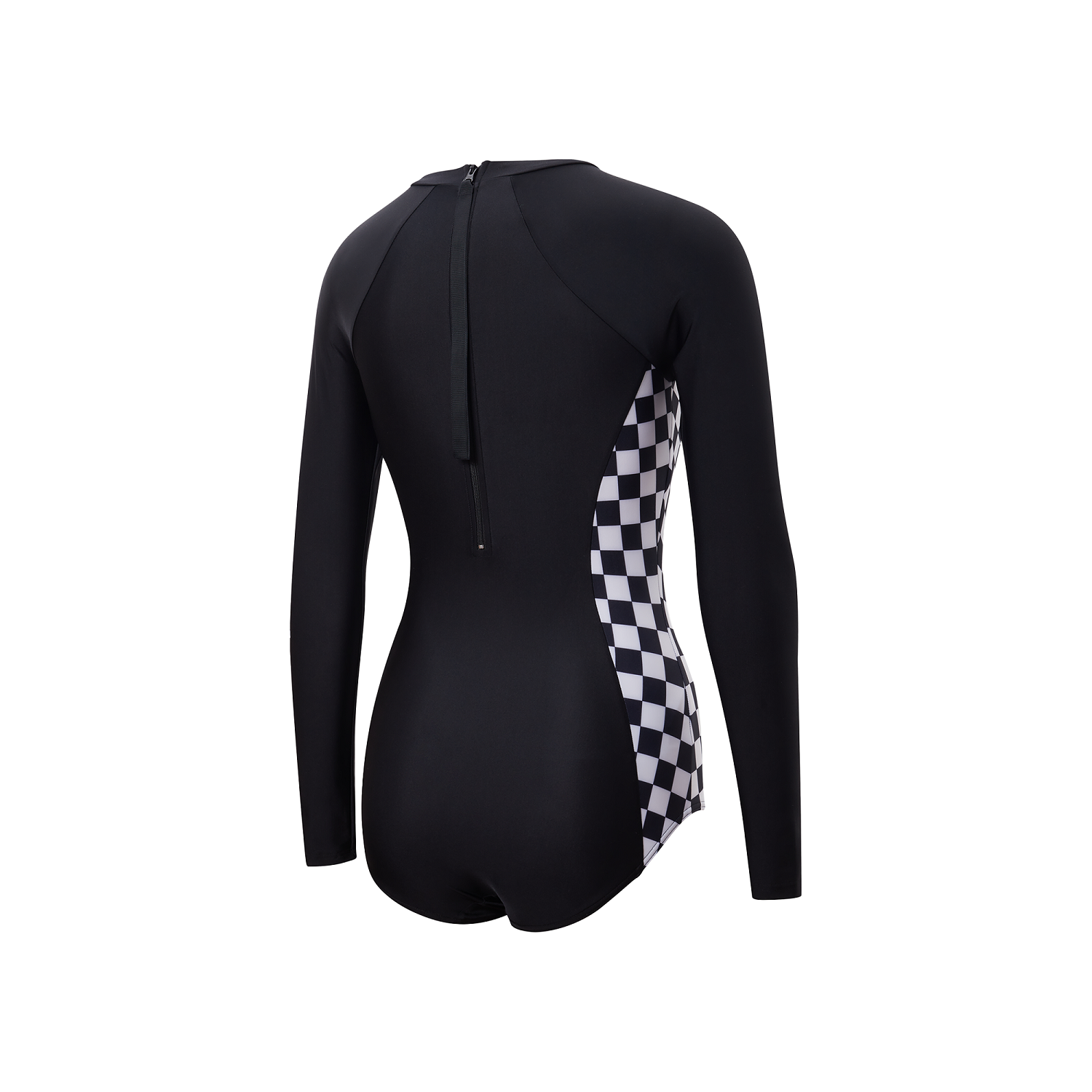 Conquer the water with the Jetsetter Long sleeve placement zip-back. It has a vibrant checkered print and a flattering fit that helps you stand out. This one-piece swimsuit is crafted from ECO EnduraBrite fabric, with a high chlorine resistance that ensures a long-lasting suit, use after use. The one-piece swimsuit also features removal bra pads and an under-bust seam, offering secure and optimal comfort while swimming. Embrace style, performance, and comfort with this versatile swimsuit.