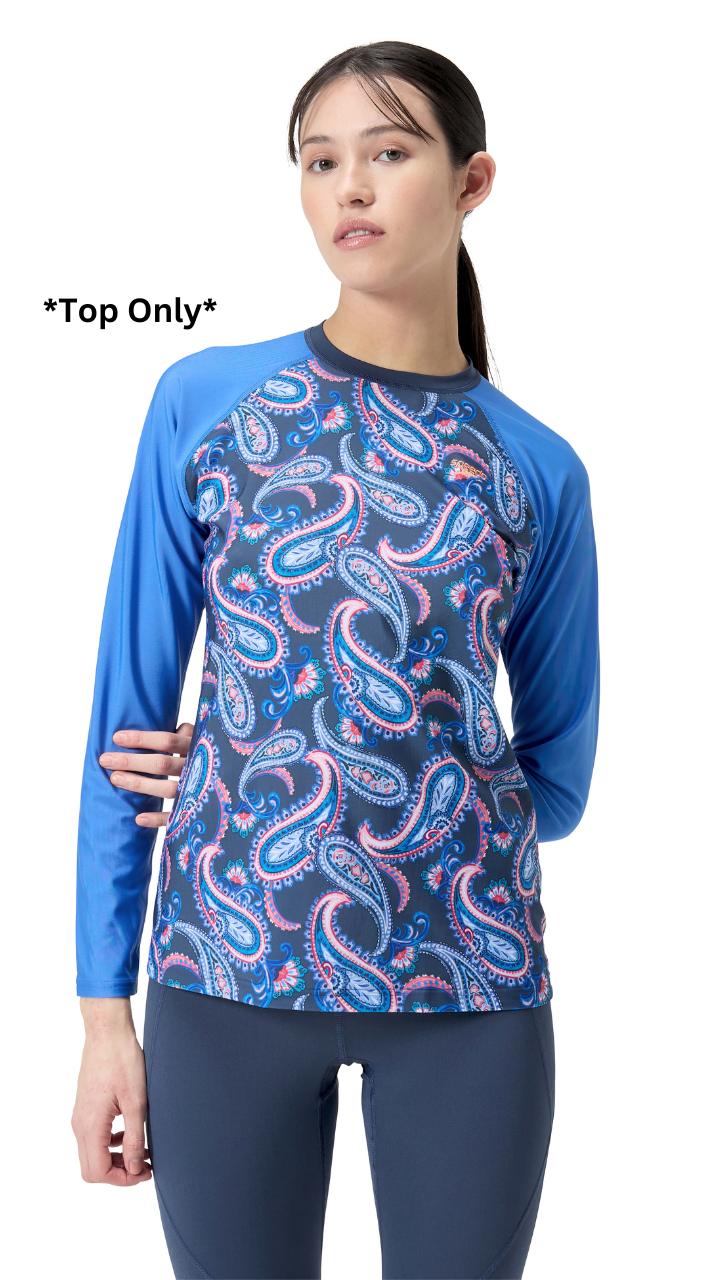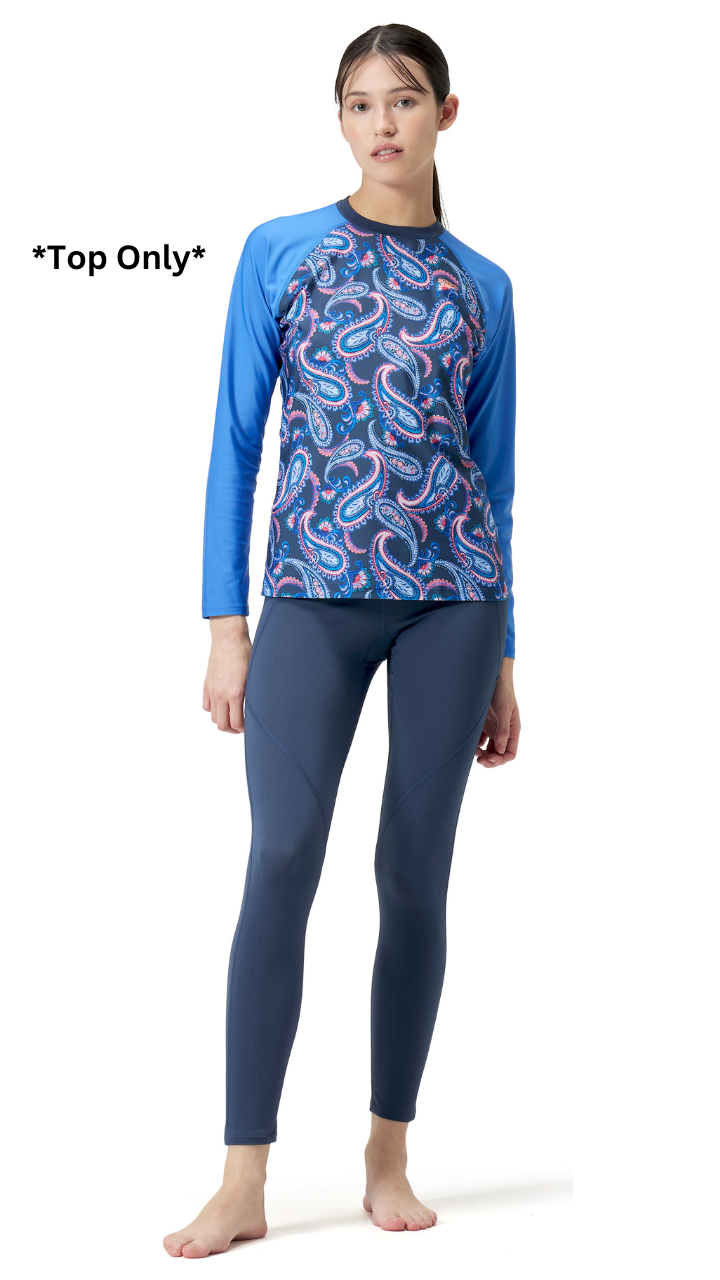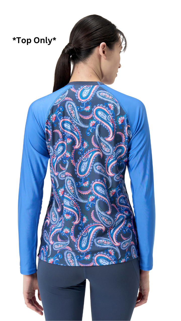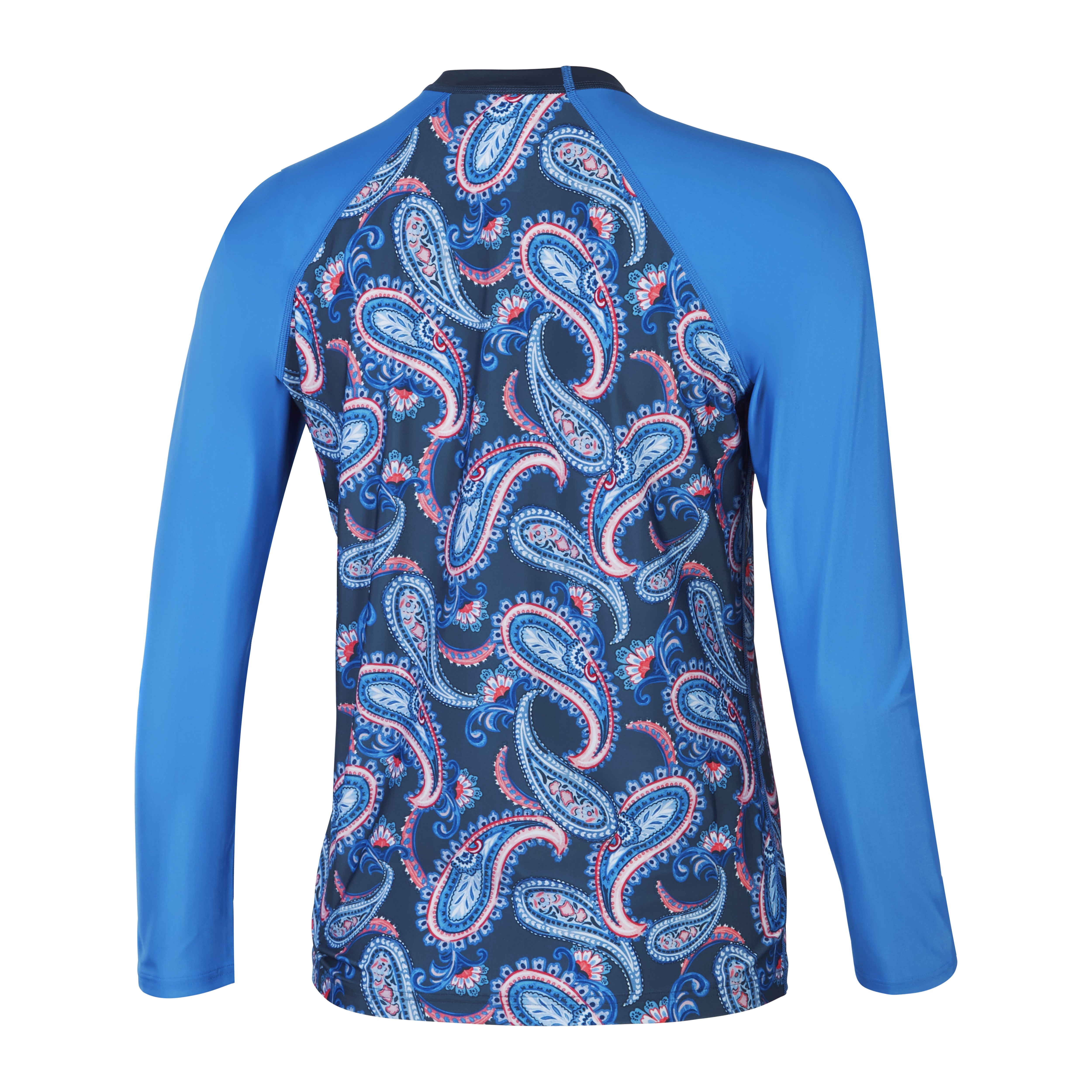 Stylish swimwear for swimming, surfing, and SUP. Our relaxed-fit Long Sleeve Swim Tee showcases a stylish paisley print design alongside contrasting blue sleeves. The Tee is ideal for the beach and board, the Tee includes long sleeves and UPF40+ fabric sun protection to keep you in and out of the water. Offering higher chlorine resistance than standard swimwear fabrics, our EnduraBrite fabric delivers superb color performance and fits like new for longer with CREORA® HighClo™. Made in part from recycled plastic bottles - the polyester yarn in the EnduraBrite fabric is made from 100% post-consumer waste.