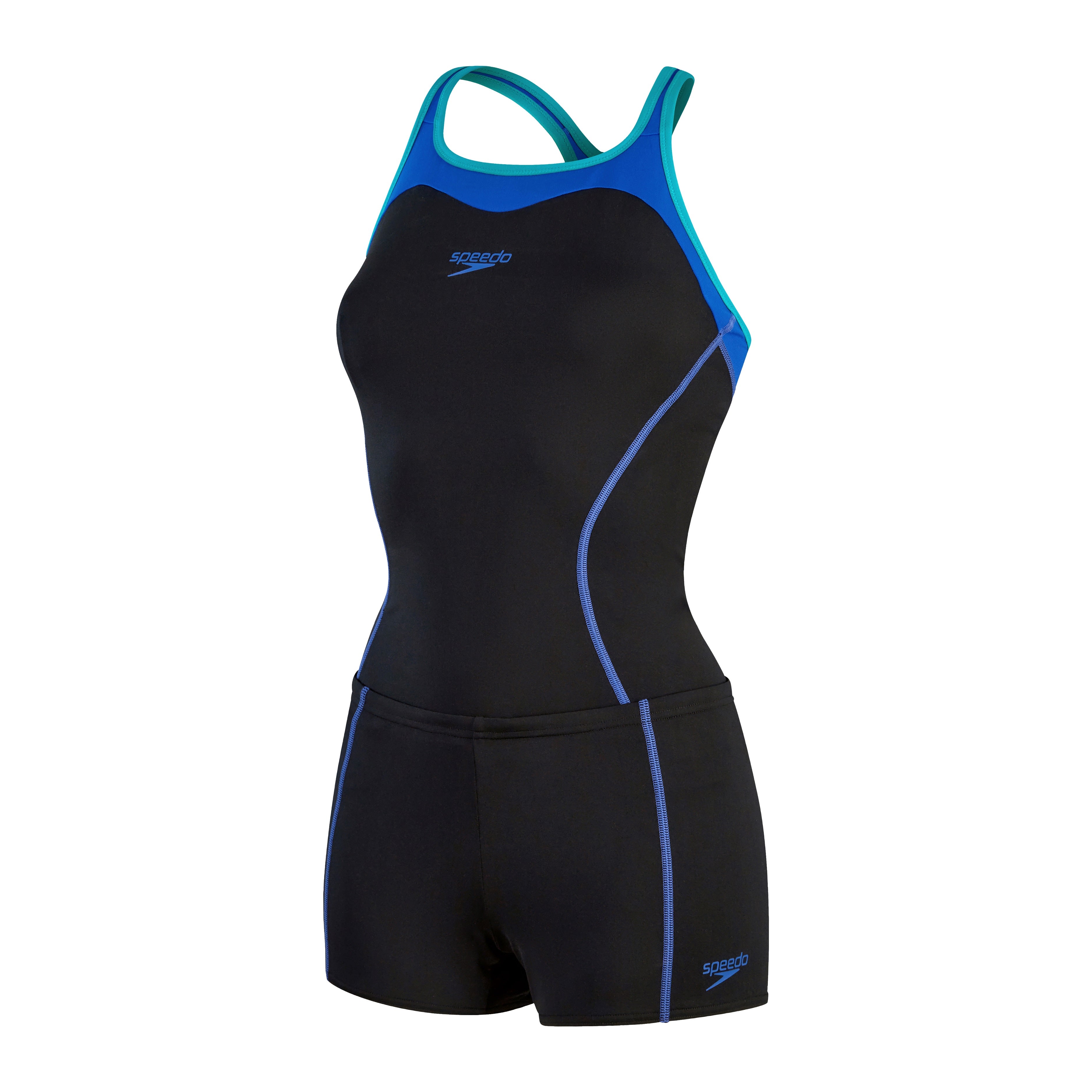 Stylish performance swimwear. Train in style and comfort wearing our sleek black Tankini featuring contrasting blue seams, straps, and back paneling. Universally flattering, the tankini delivers extra coverage with the flexibility of a two-piece and includes a boyleg short with a drawstring waist. An underbust band and removable bra pads within the tankini top provide light bust support during your workout. Designed to be durable and better for the environment, the Tankini features our ECO Endurance+ fabric which is 100% chlorine resistant, quick-drying, and made from 50% recycled materials.