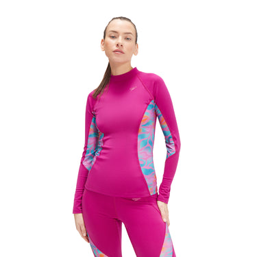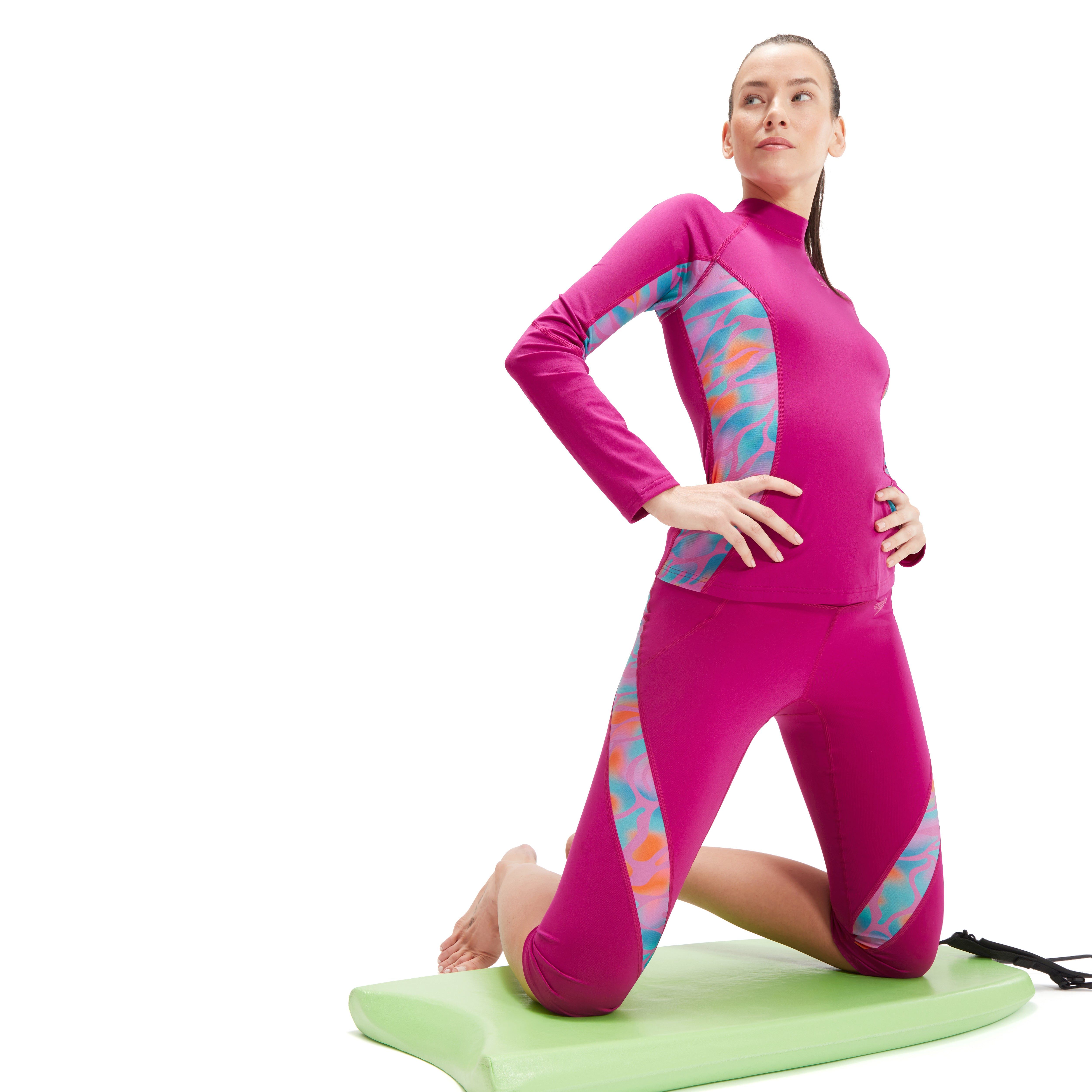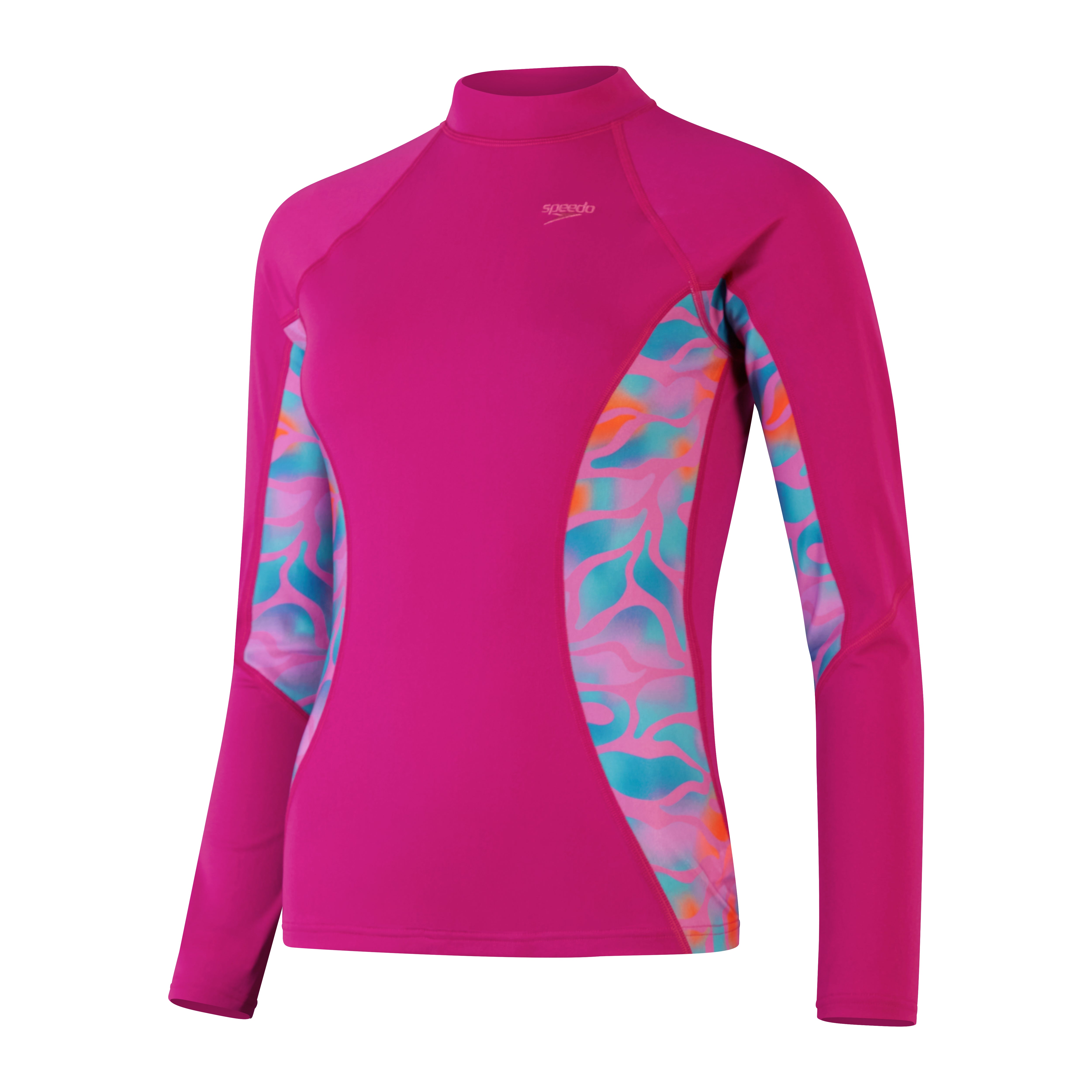 Sun protection swimwear for the beach, board, and beyond. Snug-fitting in a pull-on style, this purple Long Sleeve Rash top includes panels of our pretty leaf-inspired print. Flatlock seams on the top create a comfy fit against the body, while the UPF40+ fabric sun protection keeps you protected during long days in and out of the water. The top includes a board short loop, so you can attach it to your board shorts or leggings for a secure fit during active sea sessions. Made from our durable ECO Endurance+ fabric, it's quick-drying and 100% chlorine-resistant. Plus, one of the yarns in the ECO Endurance+ fabric is made from 100% post-consumer waste, such as recycled plastic bottles.