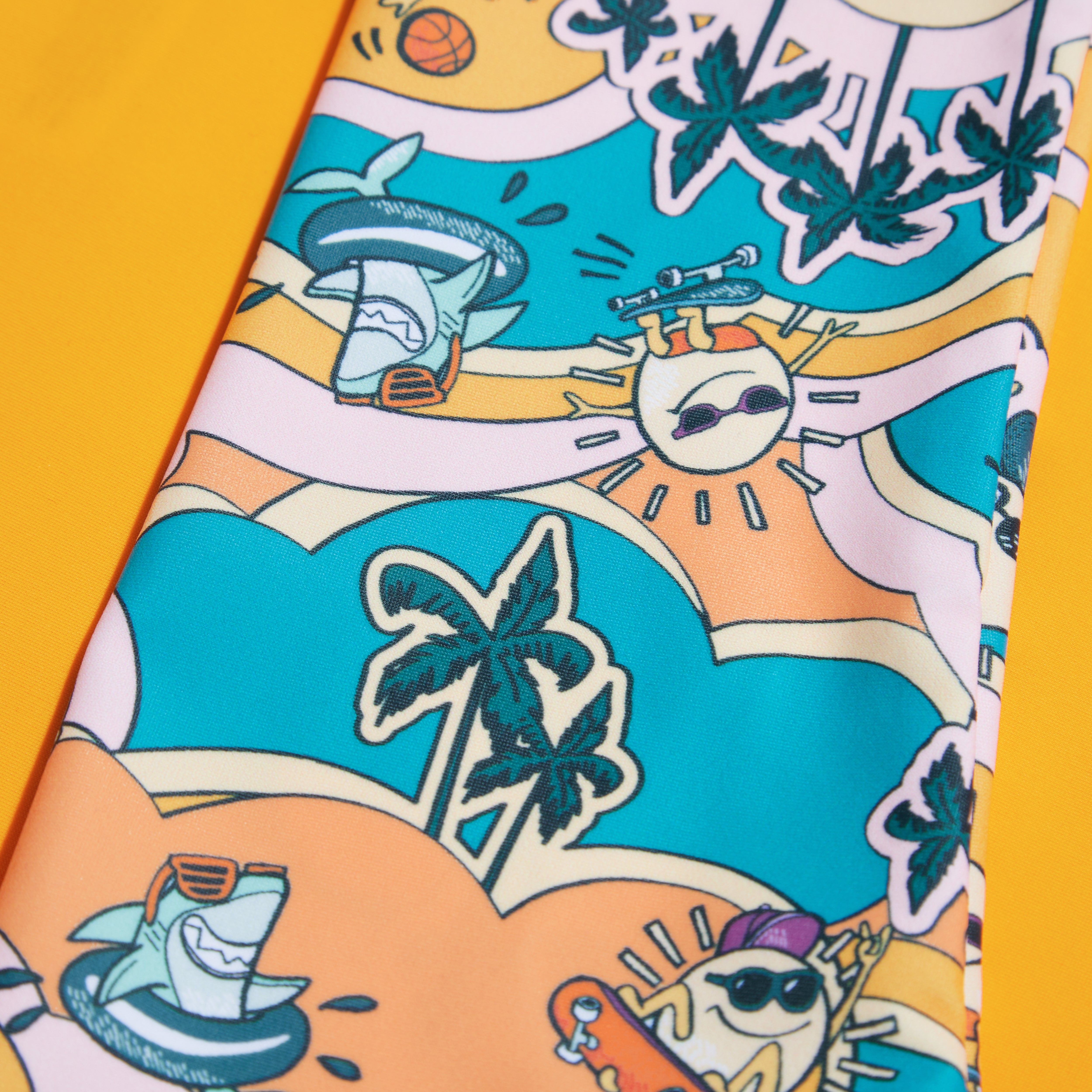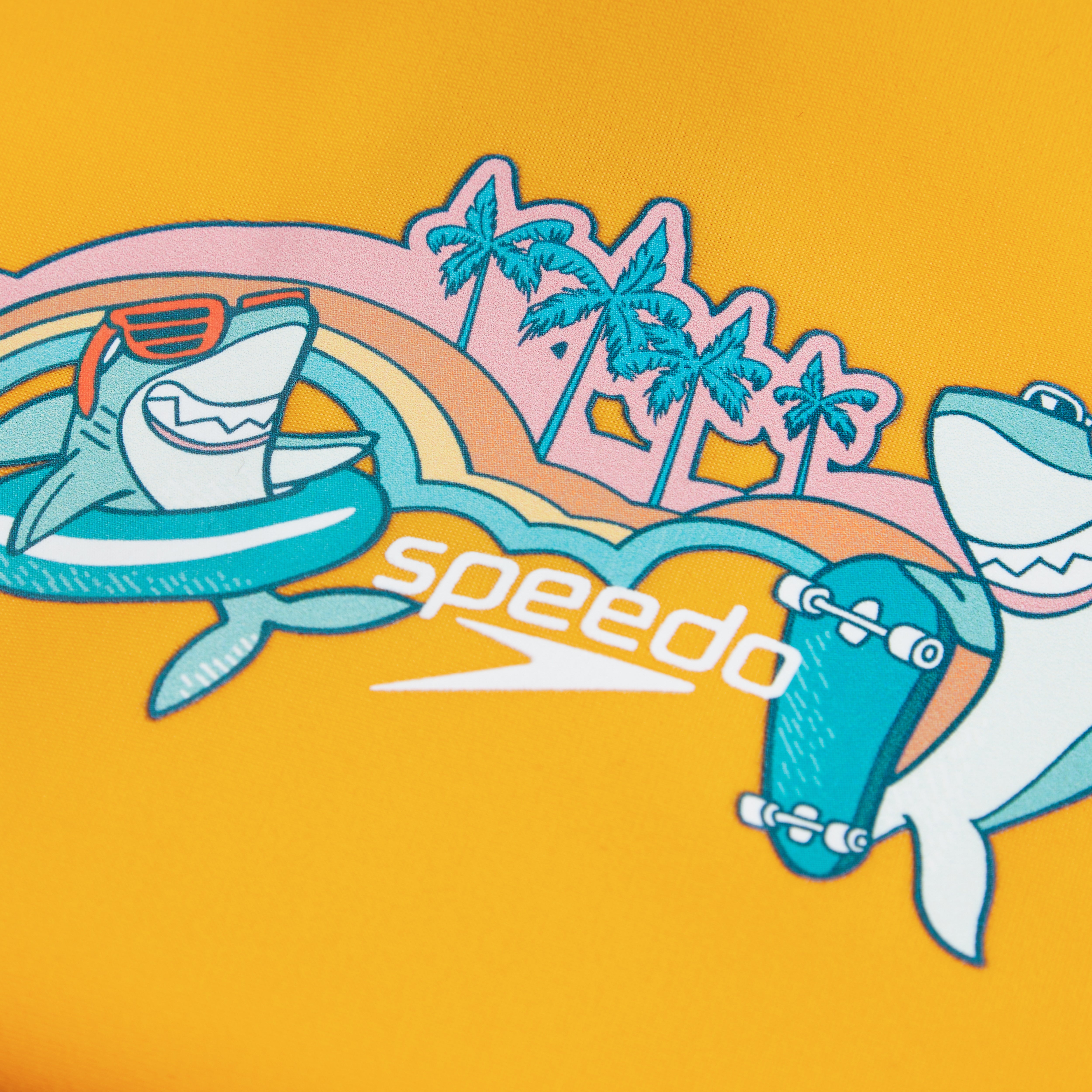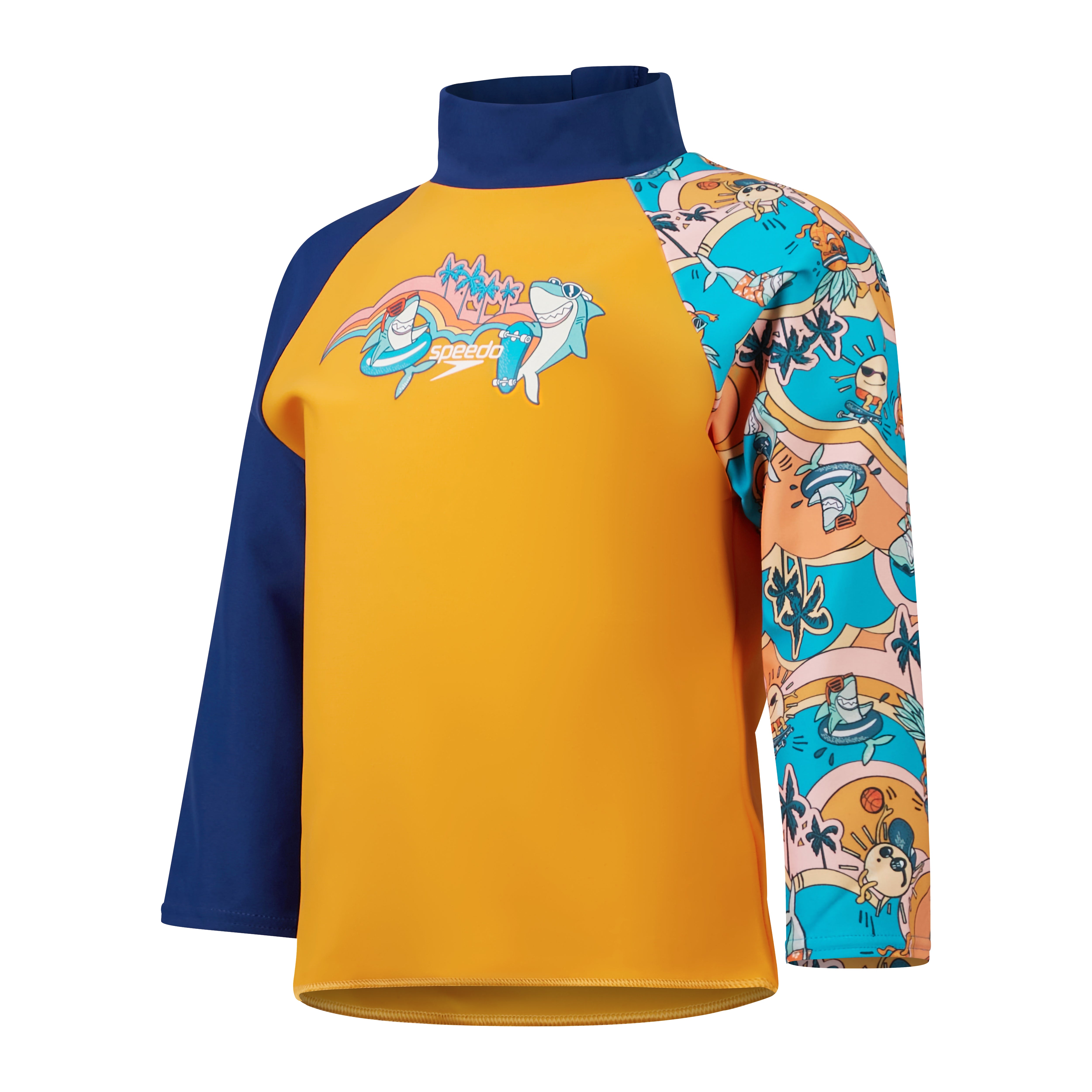 Join the Water Explorers for surfing, sun, and endless fun! Bold and bright, this Long Sleeve Printed Rash Top features a fun shark motif and includes an asymmetric sleeve in our retro-style beach print. Perfect for sunny holidays and outdoor fun, the top provides UPF40+ fabric sun protection to keep little ones protected in and out of the water. A zip-back (up to age 4) allows for easy wet-and-dry changing, and the shape-retaining fabric stretches so little bodies can move around without feeling restricted. Made from Endurance10 material, which contains CREORA¨ HighCloª for a fit that stays like new for longer.