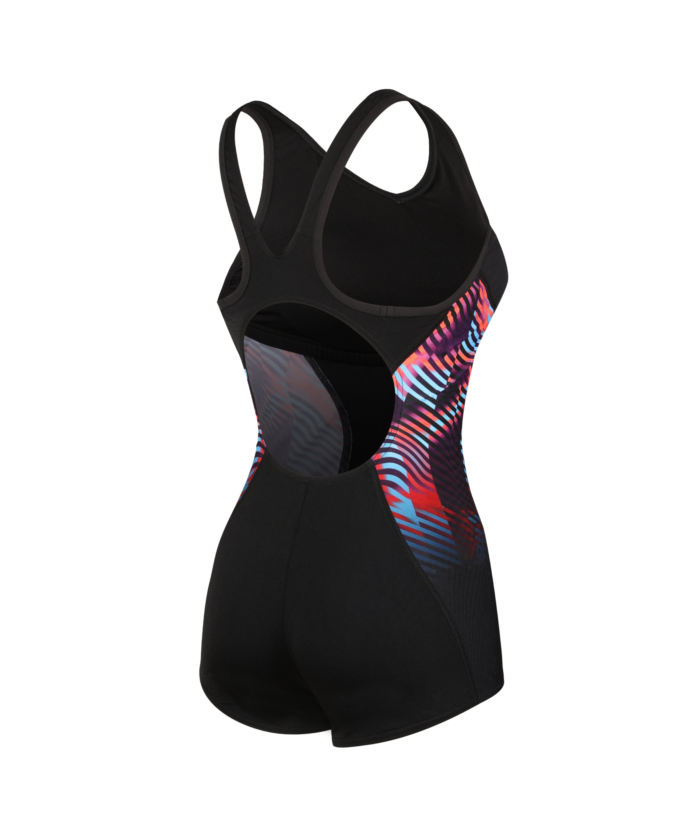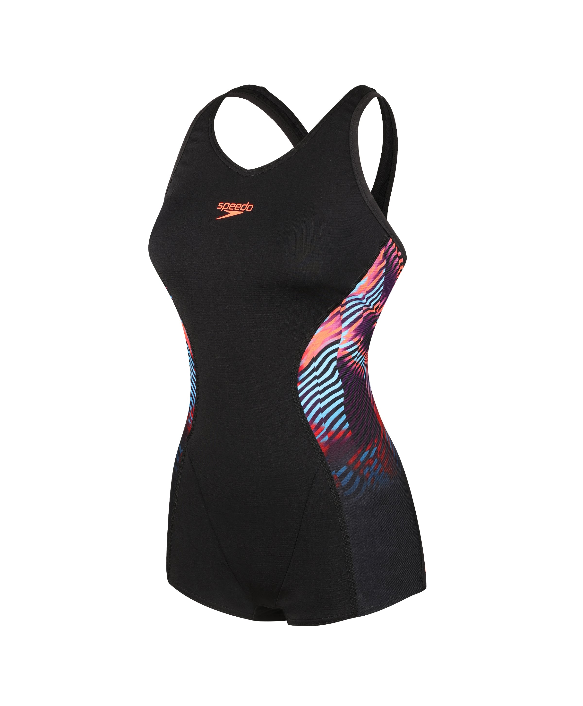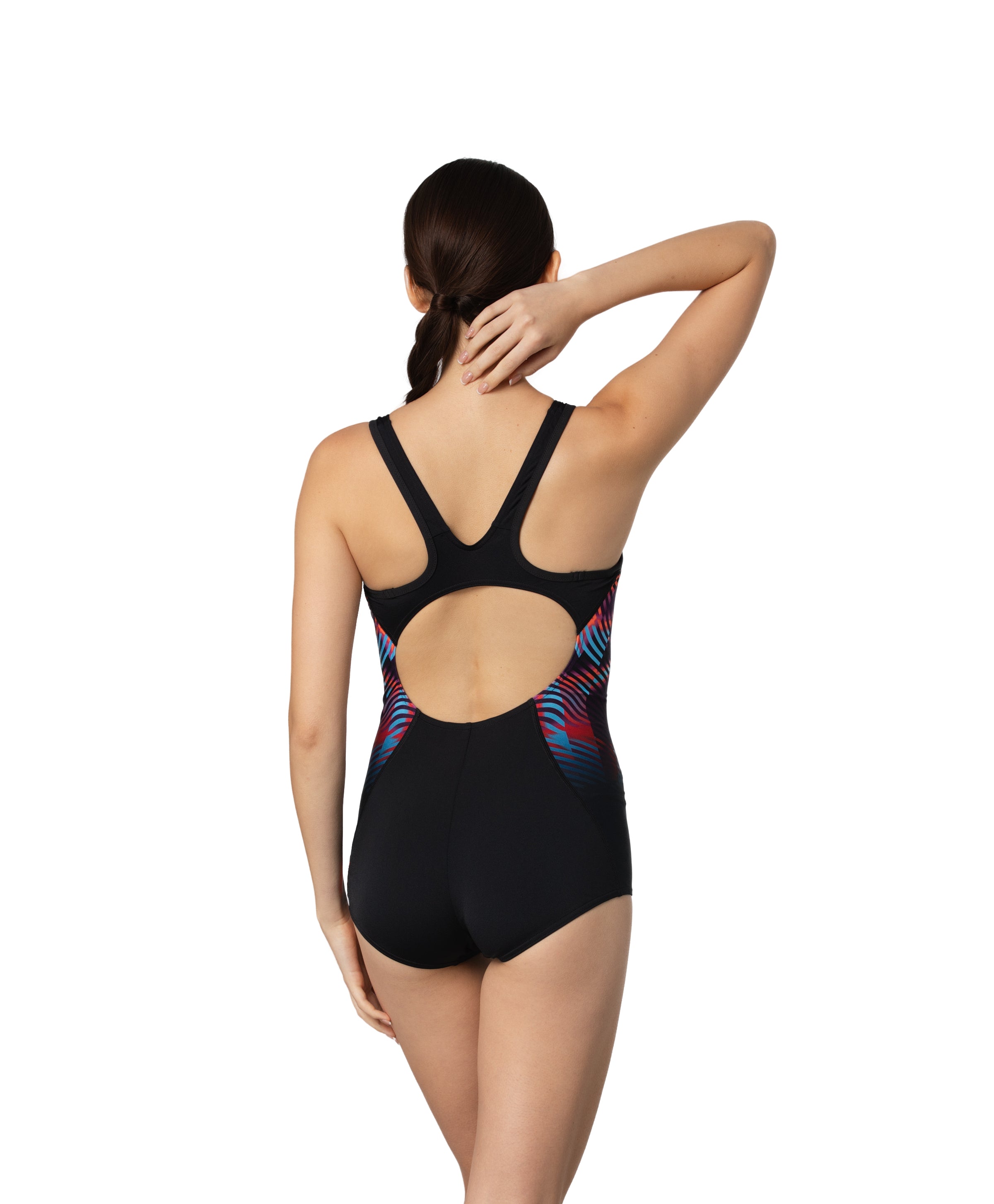 Performance swimwear. Feel confident during your workout wearing our black extra low-leg swimsuit, which features flattering printed side panels that visually slim the body. Longer than standard swimsuits, it’s ideal for swimmers seeking extra leg coverage. The stylish design includes removable bra pads for shape and modesty. Made from our durable Endurance+ fabric, it's quick-drying and 100% chlorine-resistant. Plus, one of the yarns in this fabric is made from 100% post-consumer waste, such as recycled plastic bottles.