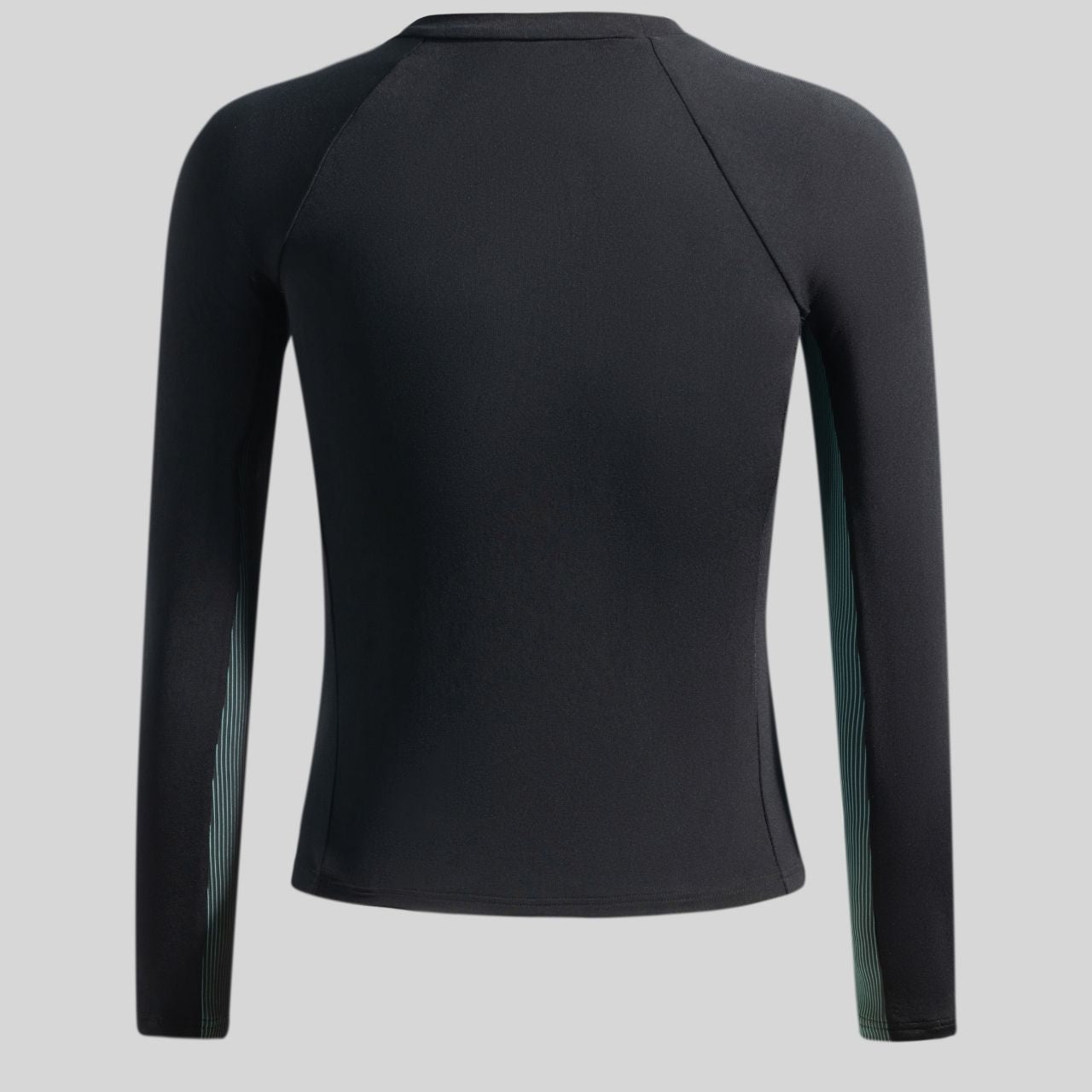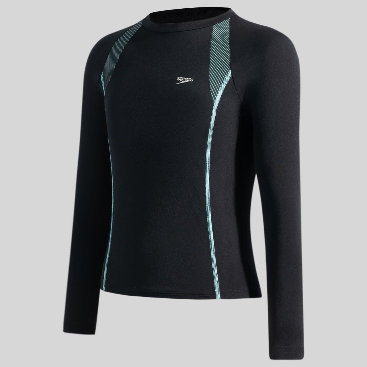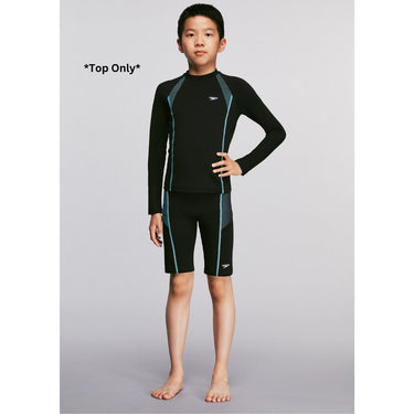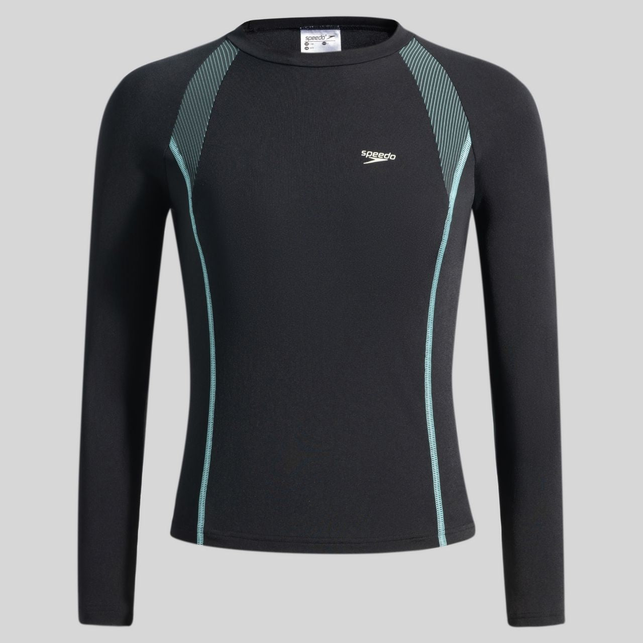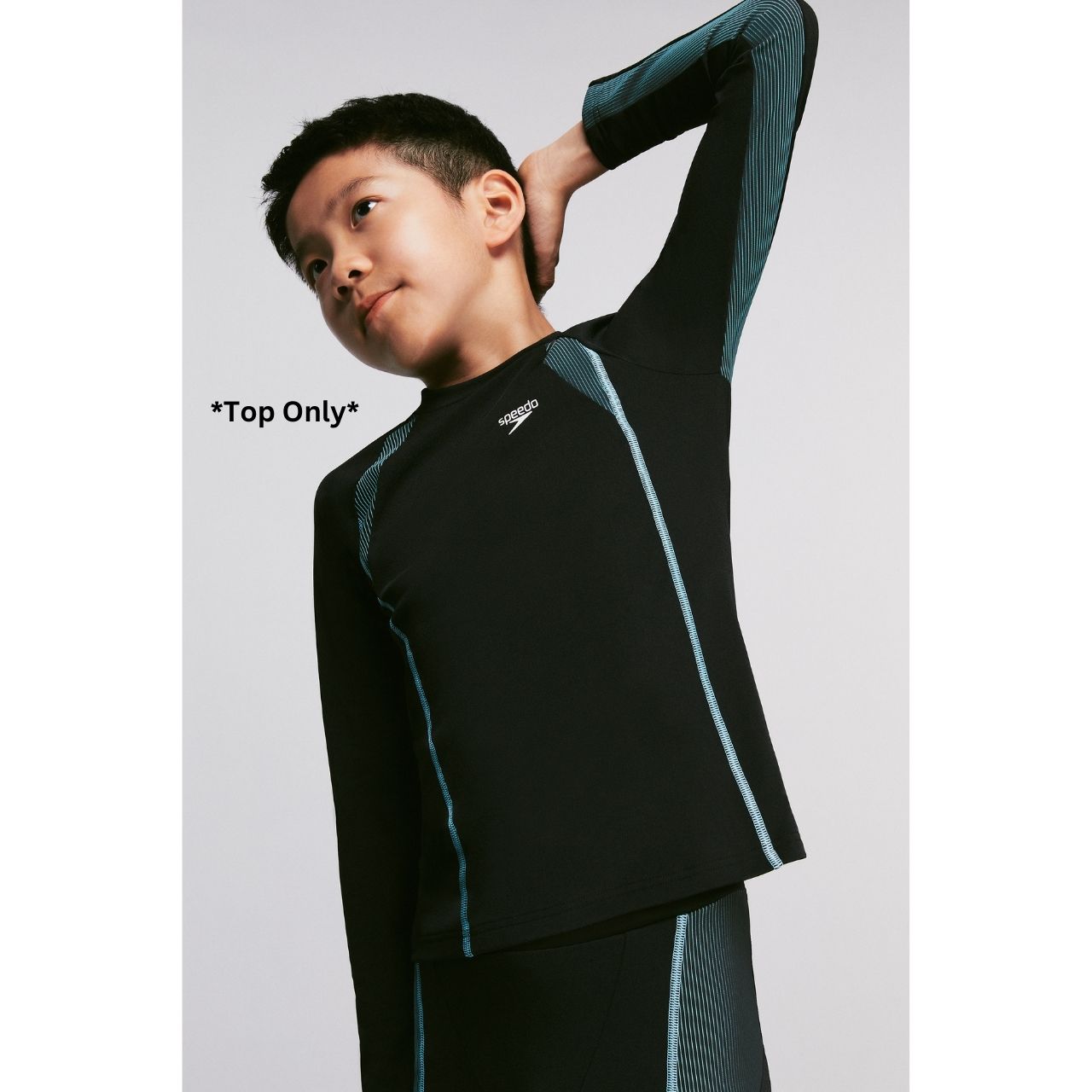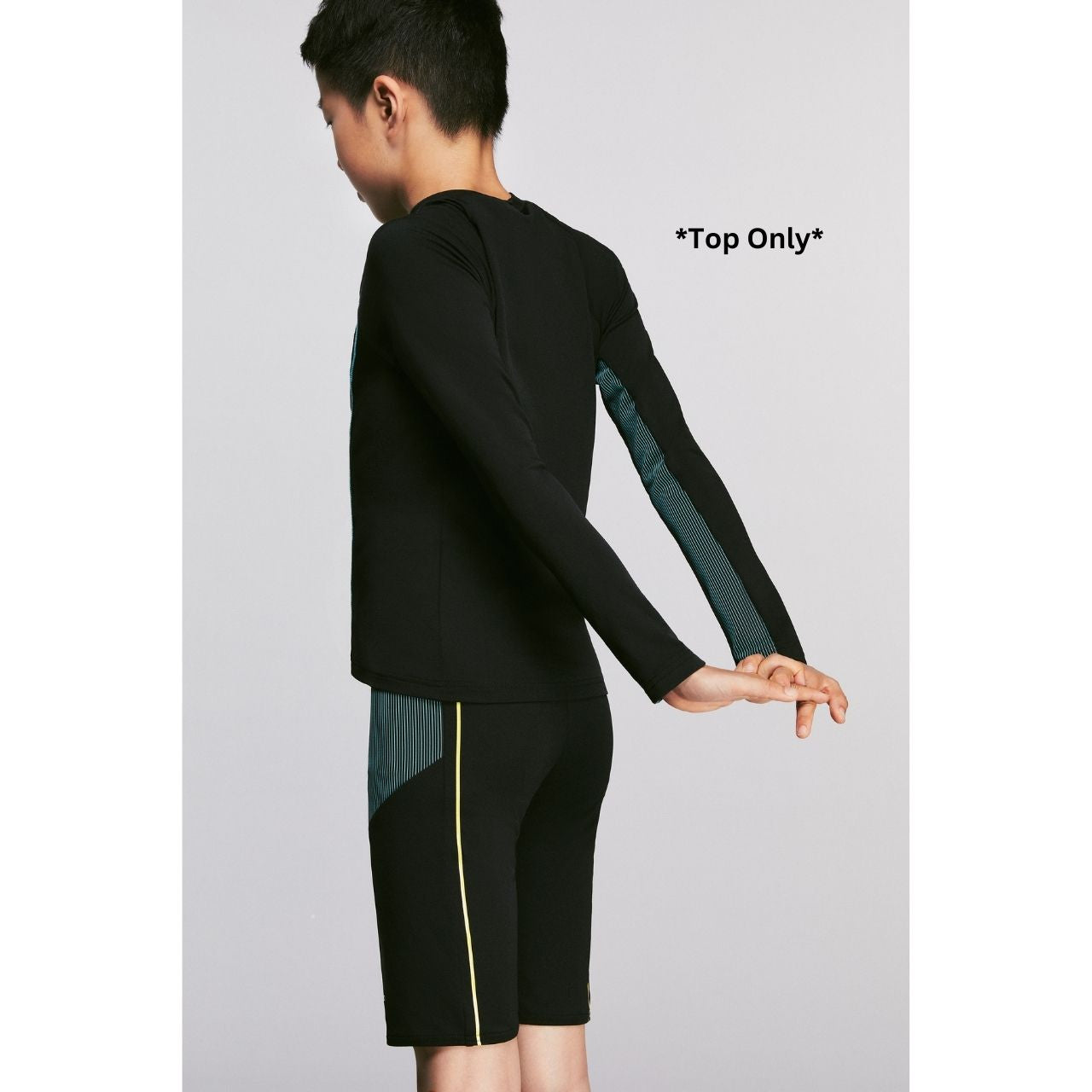 Hero 6.0 Junior Boy Long Sleeve Rashguard. Light and shadow in sync, presenting a new style of swimwear. Efficient UV protection for outdoor and indoor activities. Fast drying and breathable, offering a seamless transition between land and water. Advanced fabric technology for unwavering color protection. Endurance + MAX technology keeps water beads rolling off without sticking. Highly resistant to chlorine, offering lasting protection that remains as good as new. Partially made from recycled materials, these swimsuits offer premium comfort and functionality while prioritizing sustainability.